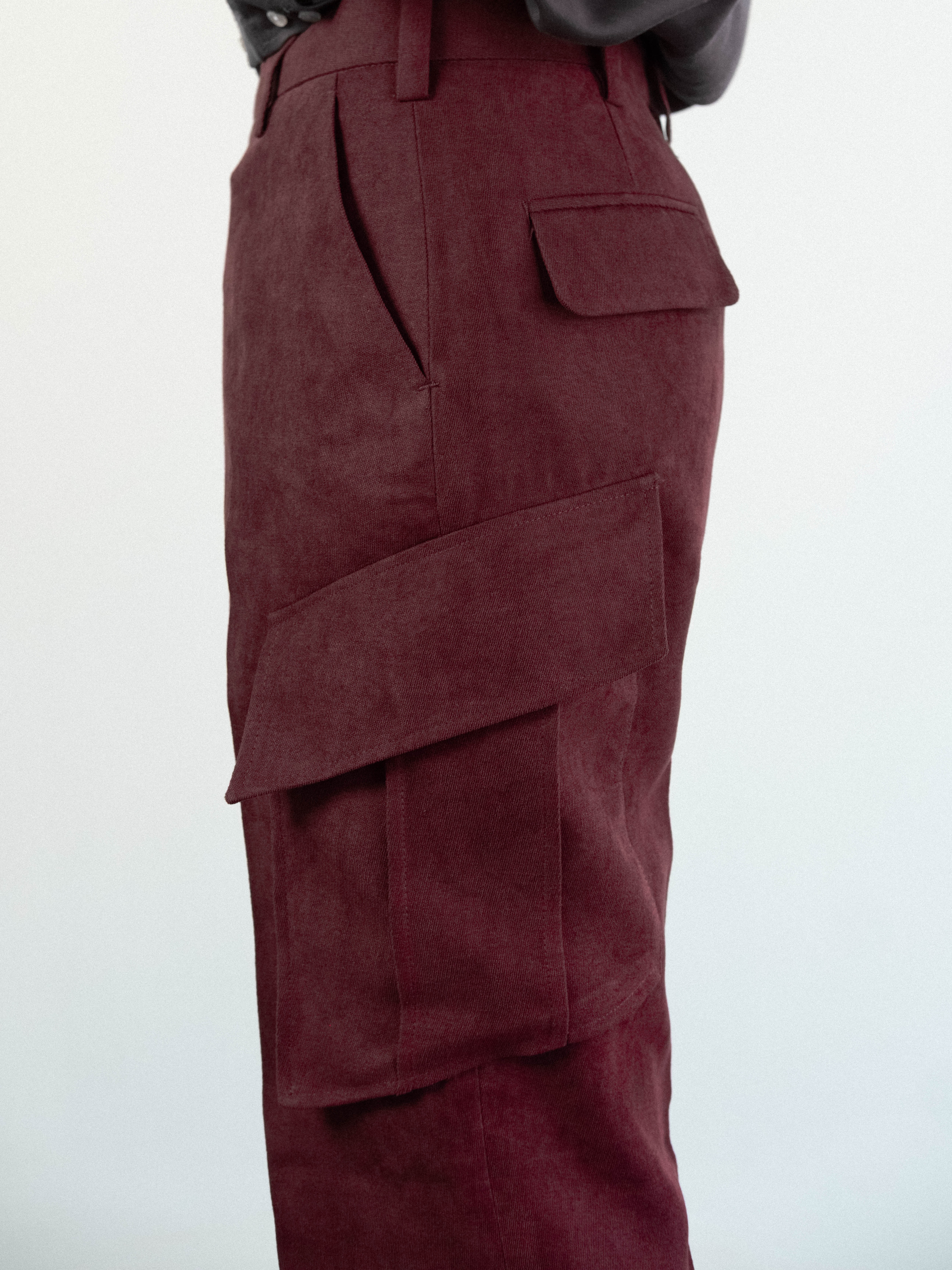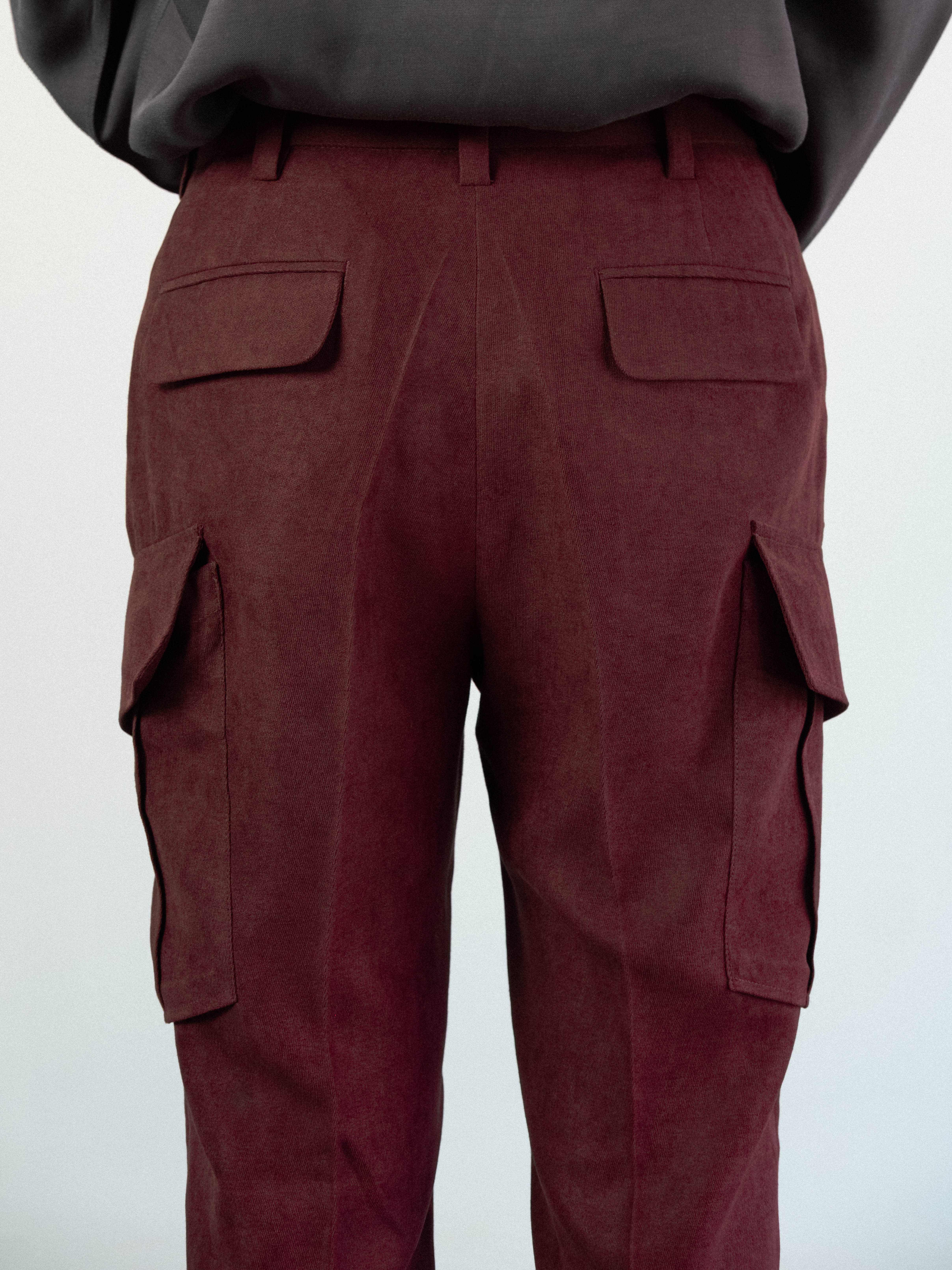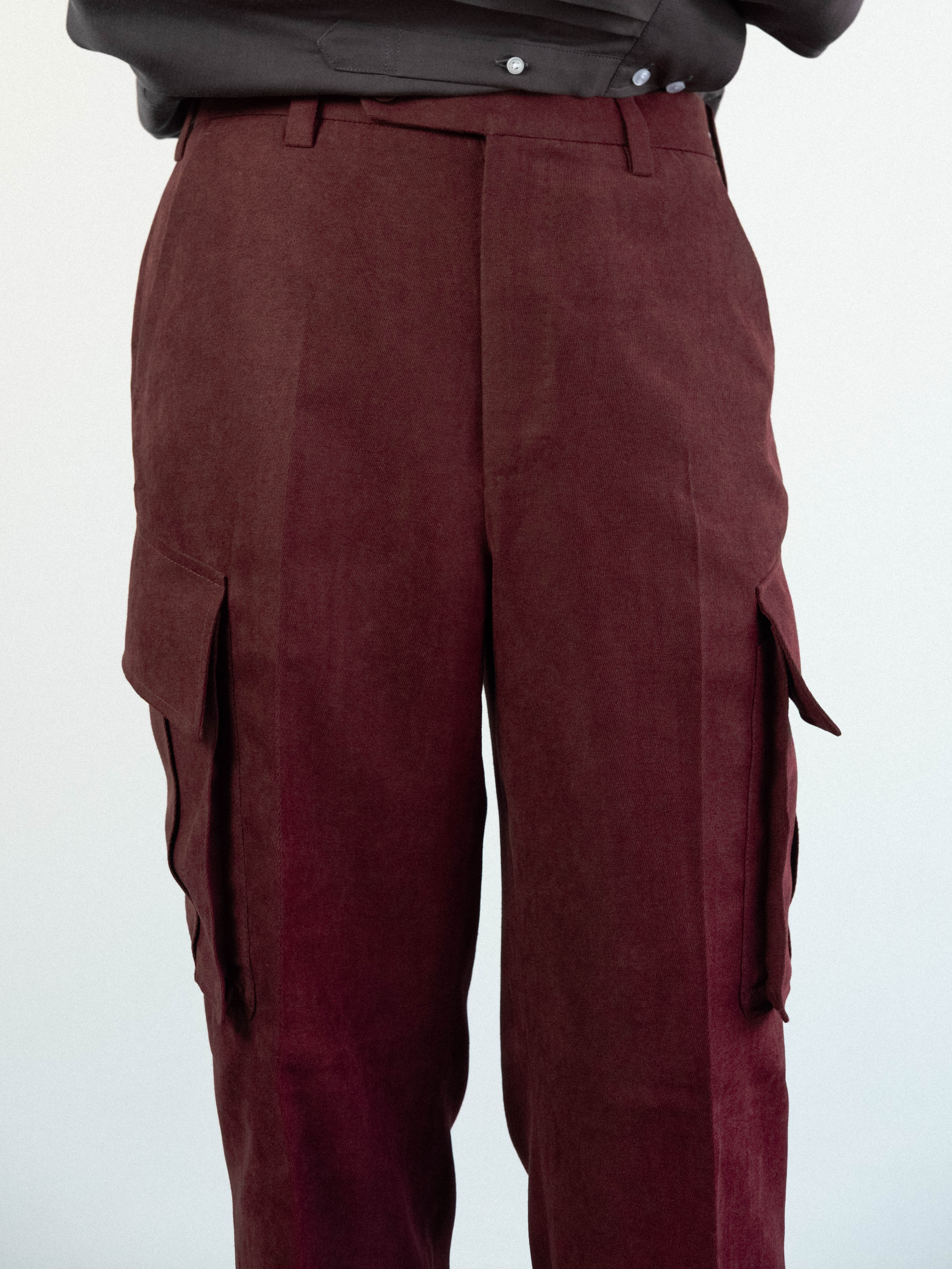 Military-inspired cargo trousers in a textured burgundy fabric. Cut to sit high on the waist with a structured waistband, the trousers feature a button-tab closure and belt loops. The silhouette is defined by sharp flat front, flowing into a generous straight leg. A series of functional, angular flap pockets and deep side-entry pockets distributed across the thigh, are integrated into the outseam and 2 flap pockets on the back.