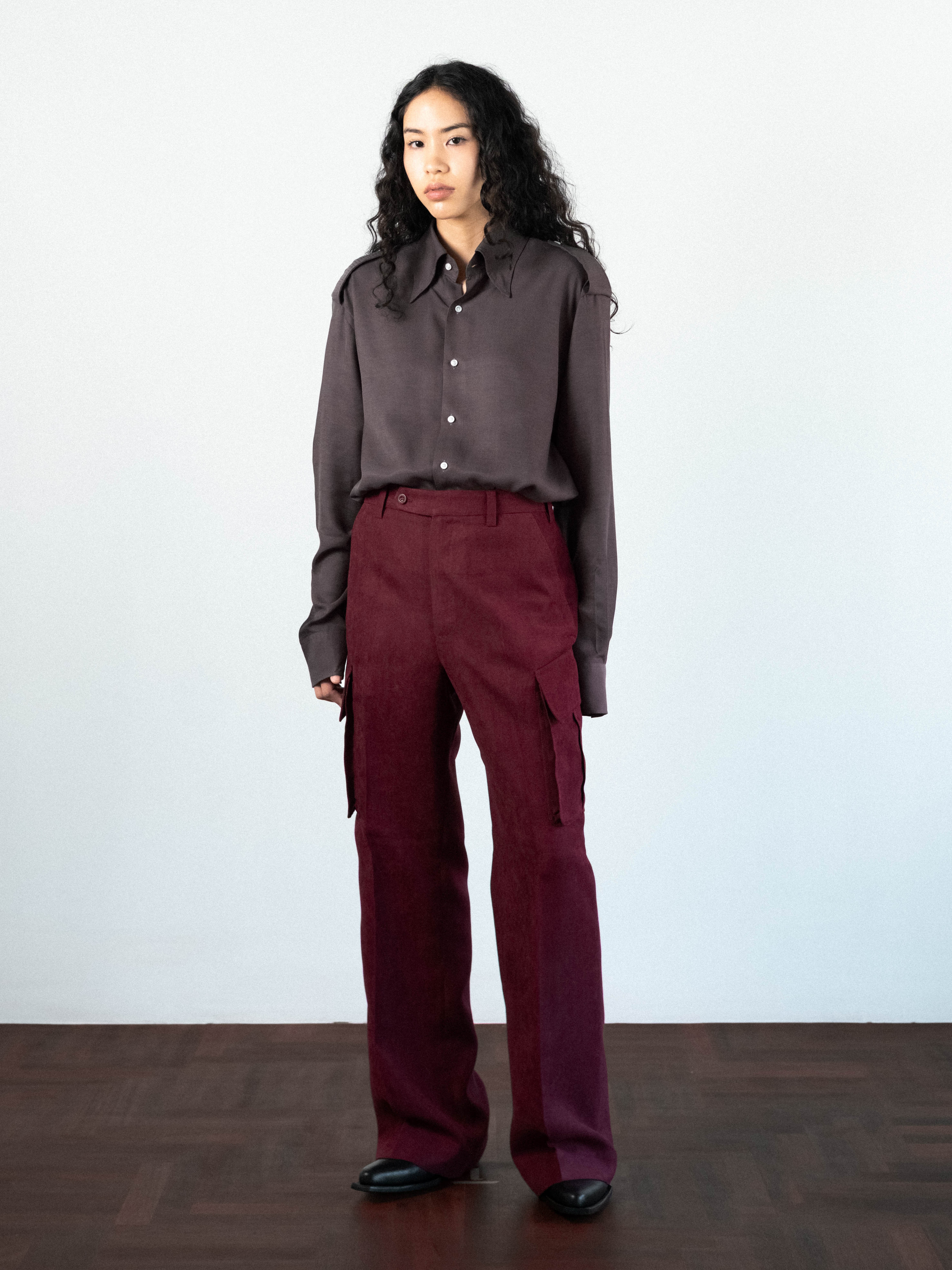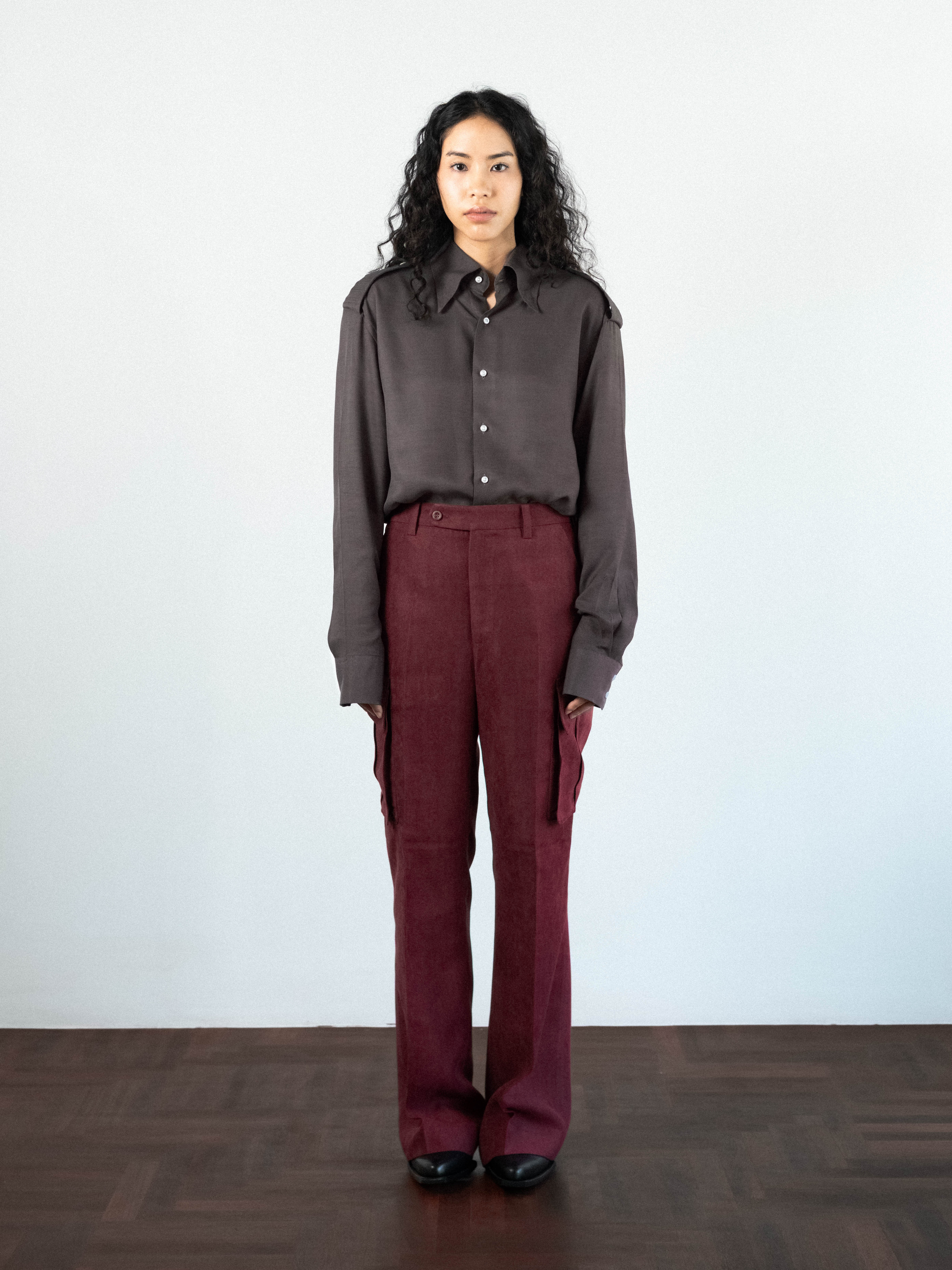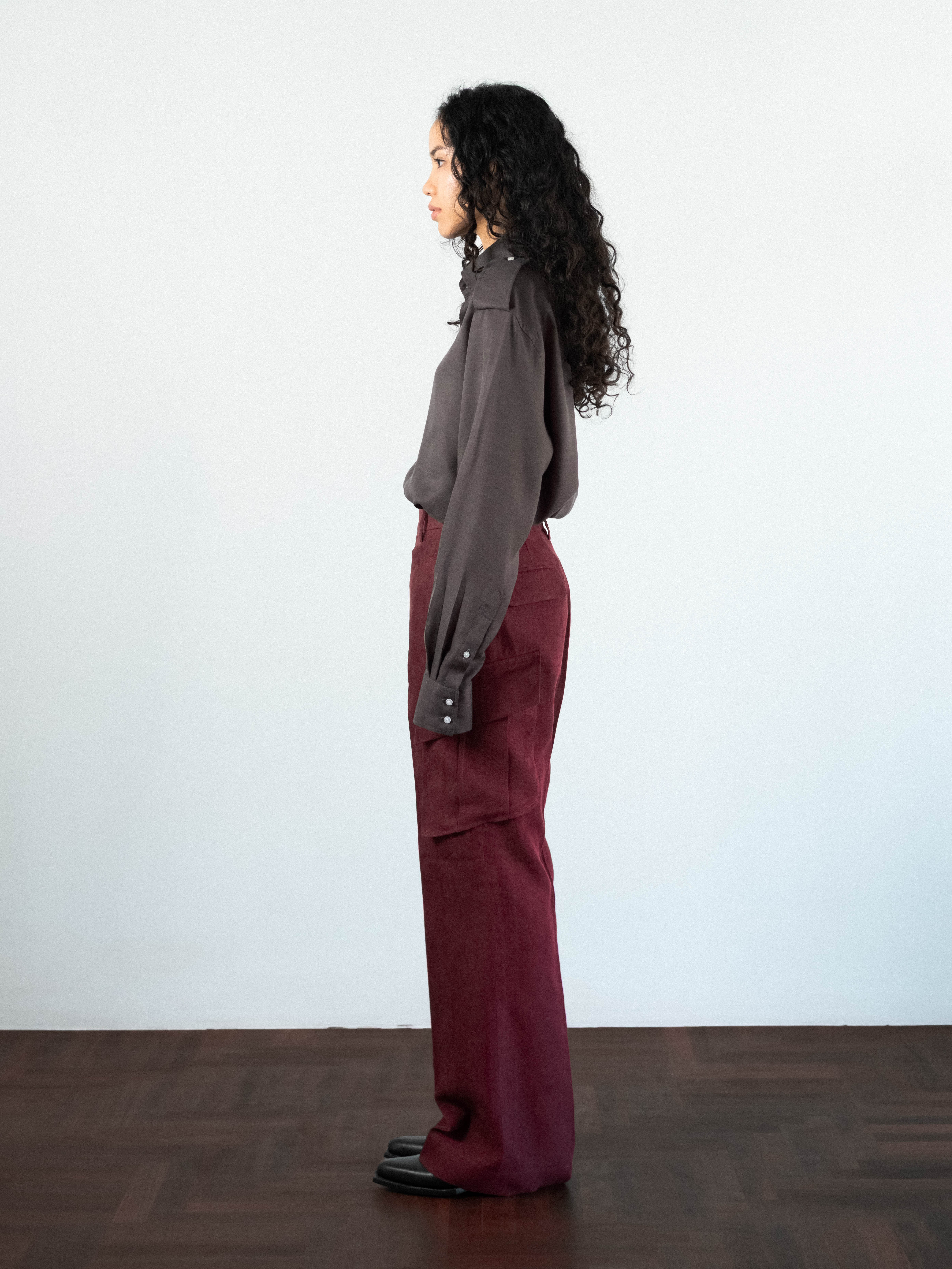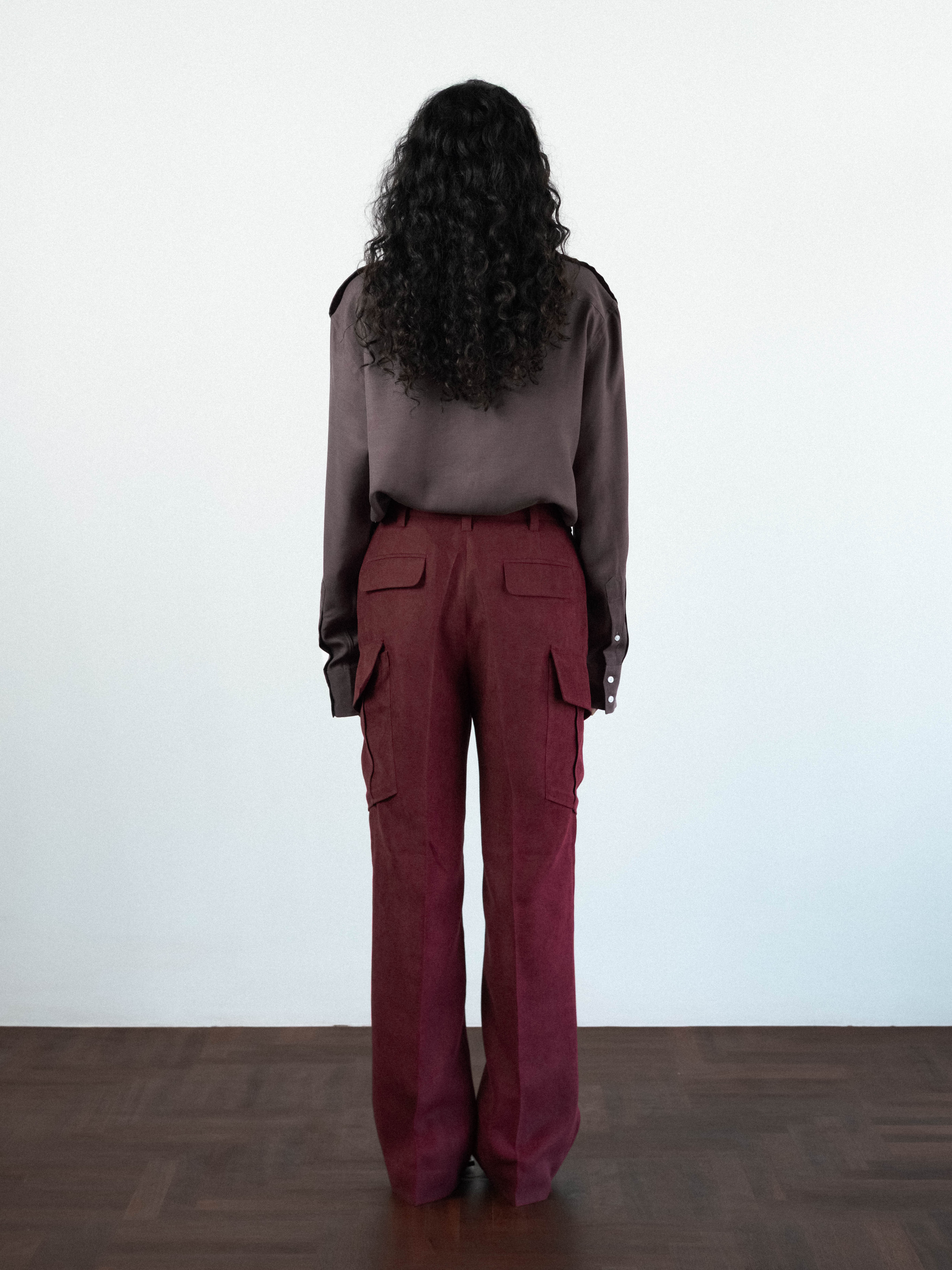Military-inspired cargo trousers in a textured burgundy fabric. Cut to sit high on the waist with a structured waistband, the trousers feature a button-tab closure and belt loops. The silhouette is defined by sharp flat front, flowing into a generous straight leg. A series of functional, angular flap pockets and deep side-entry pockets distributed across the thigh, are integrated into the outseam and 2 flap pockets on the back.