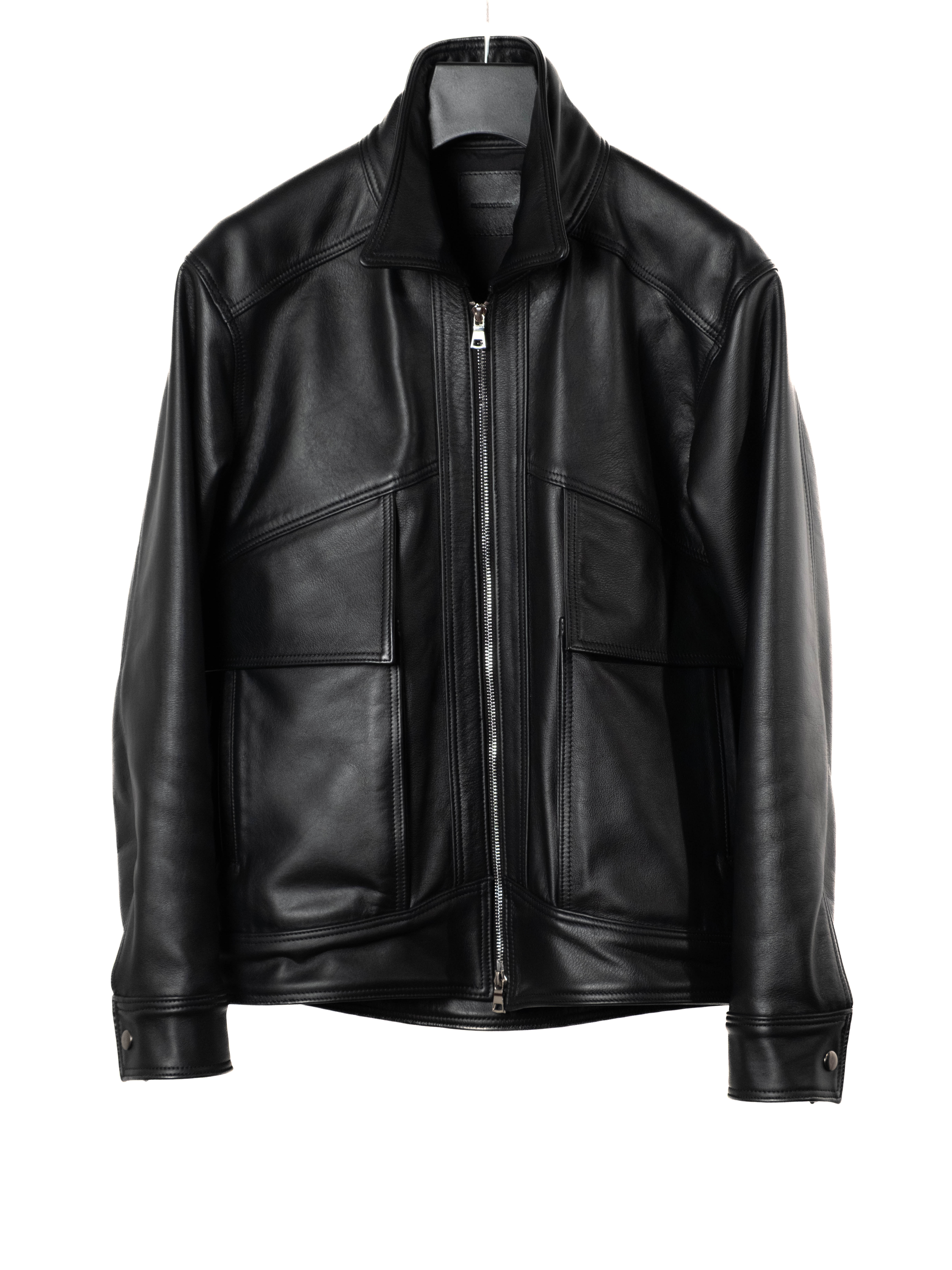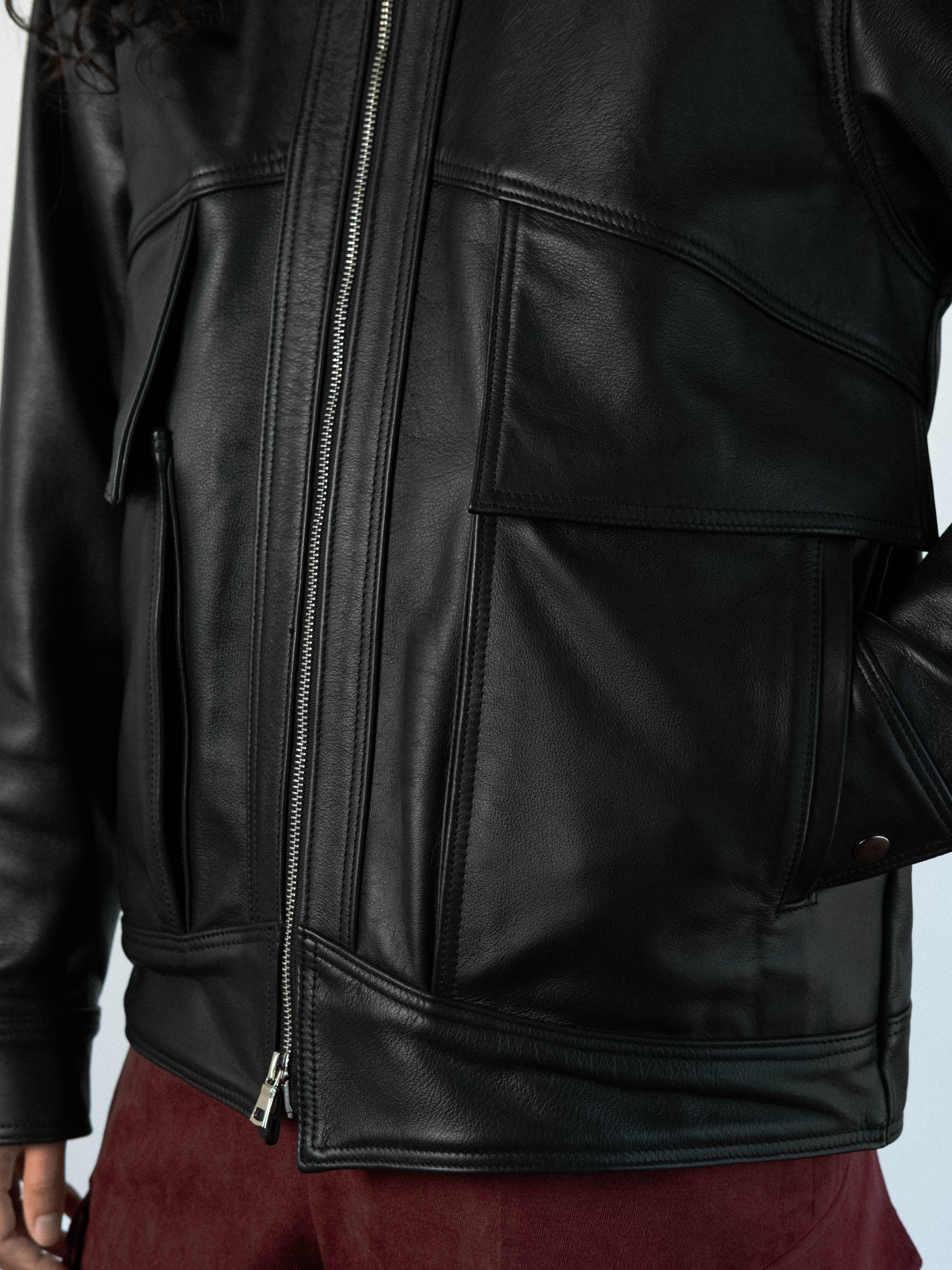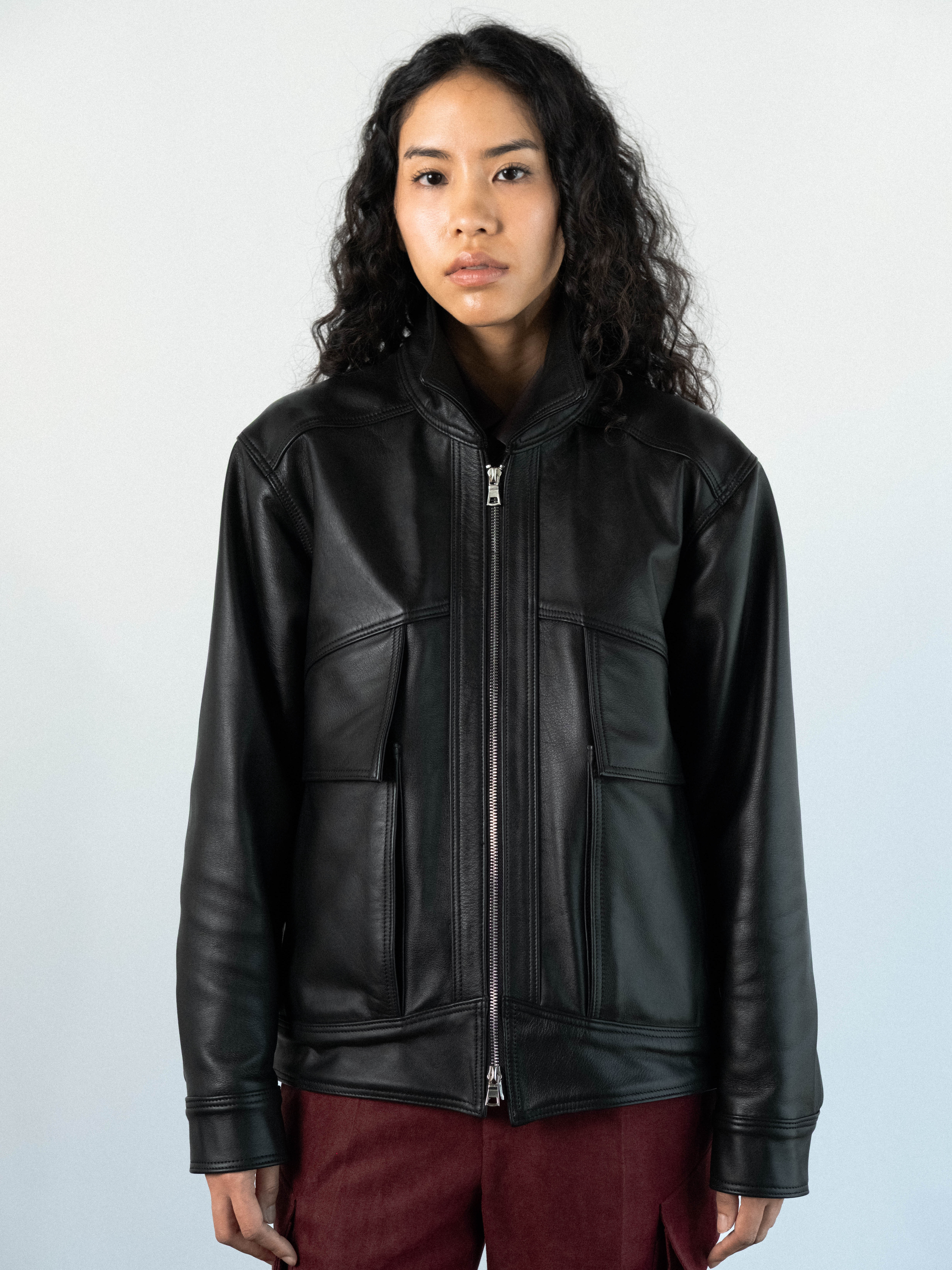 Aviator jacket in a supple, black sheep skin. Defined by a high, structured collar and oversized geometric patch pockets, the jacket strikes a balance between vintage flight gear and modern minimalism. Cut with a straight, boxy fit and a dropped shoulder, it features a heavy-duty silver-tone zip closure and reinforced topstitching. Designed with a clean-lined hem and cuffs, the piece offers a protective, weighted feel. The premium leather provides a natural sheen ensuring the garment develops a unique patina.