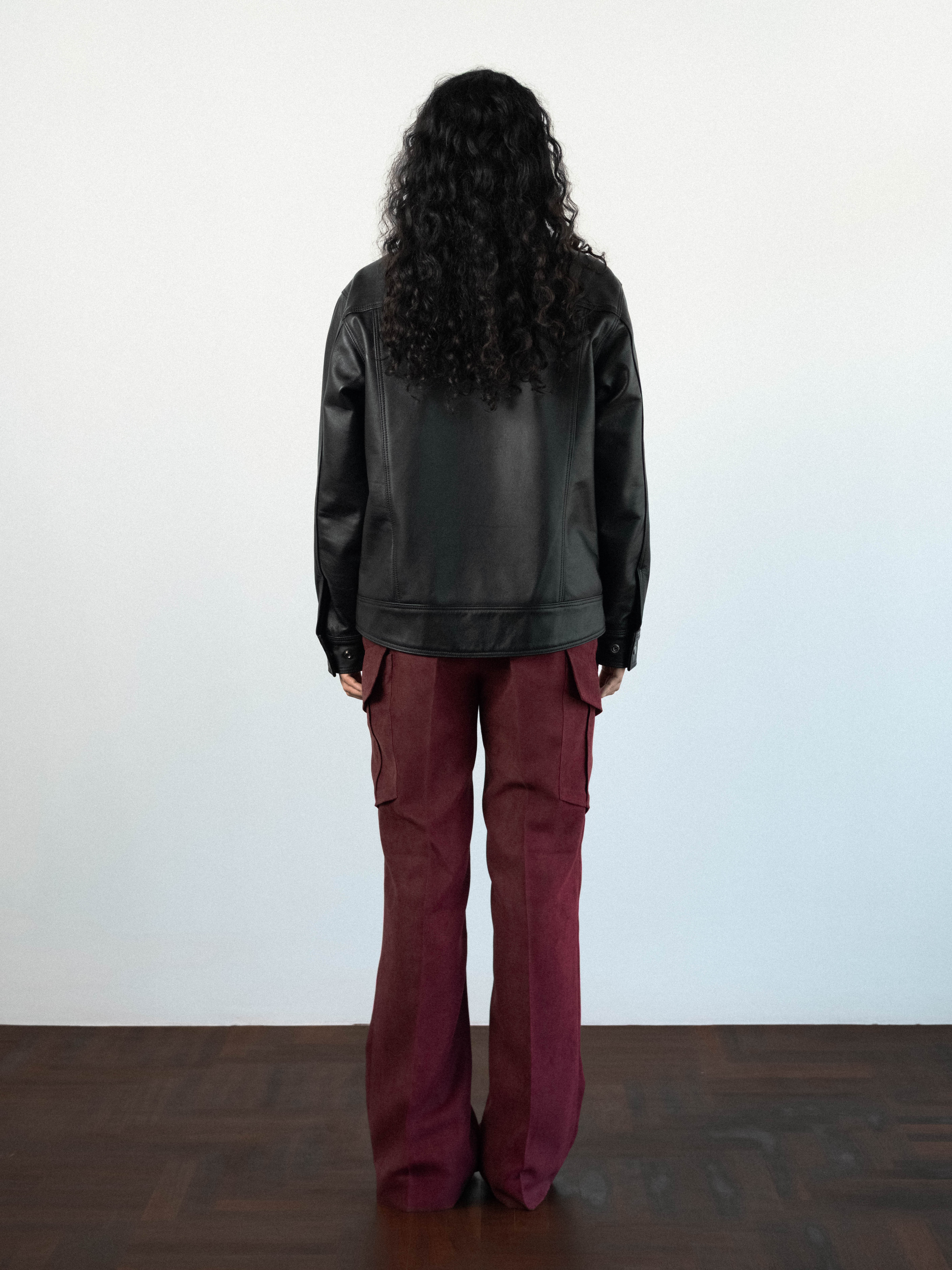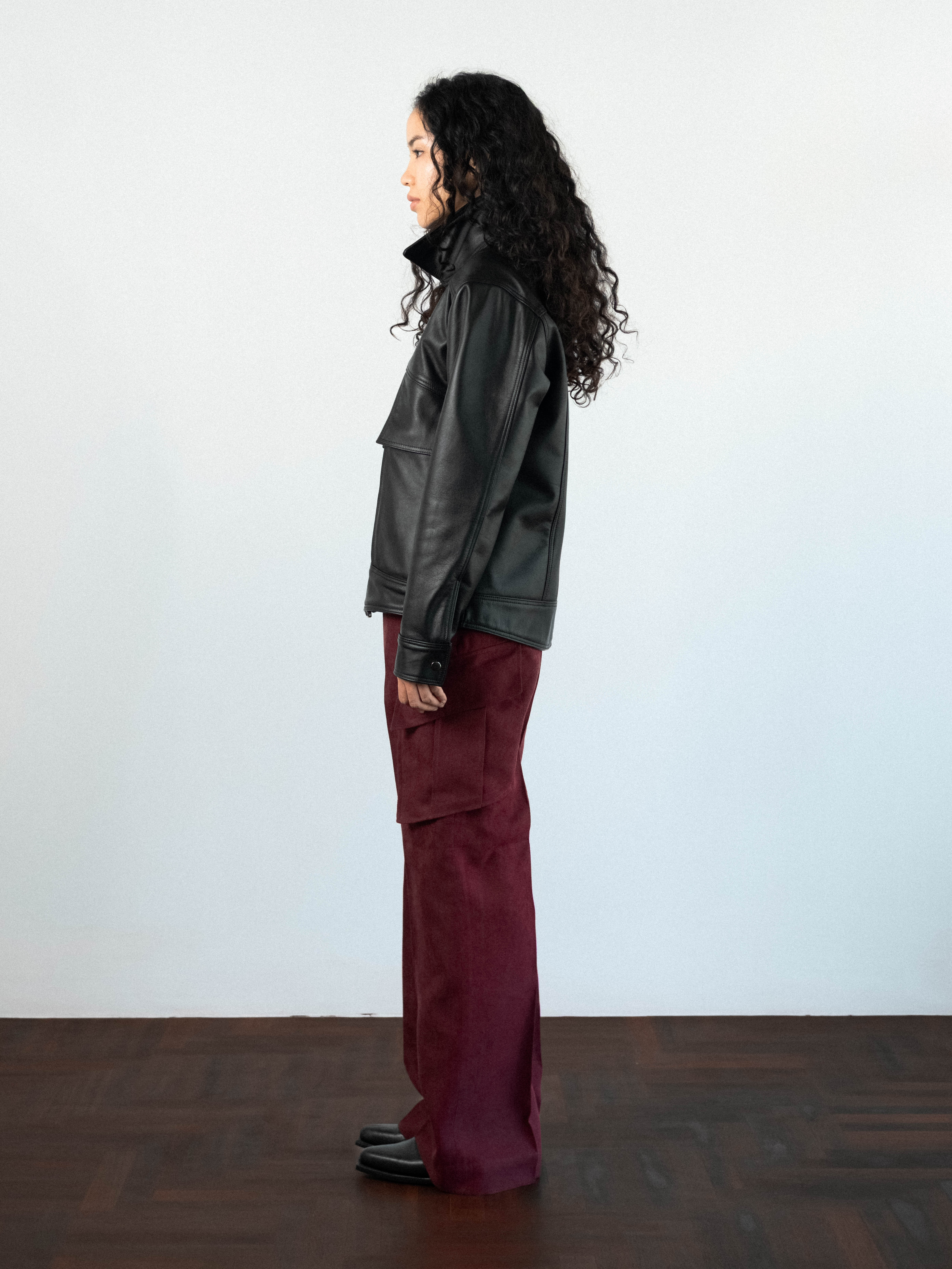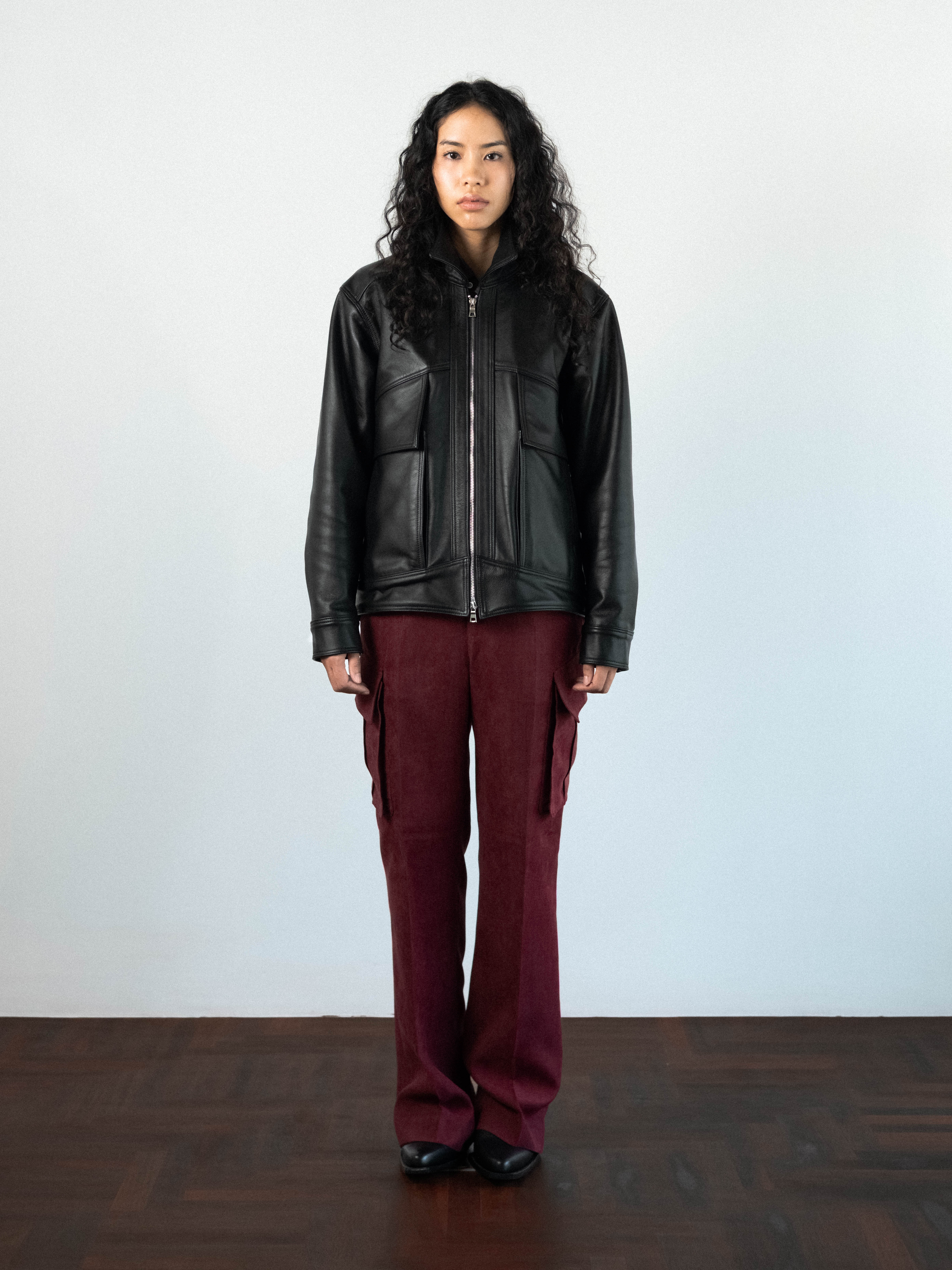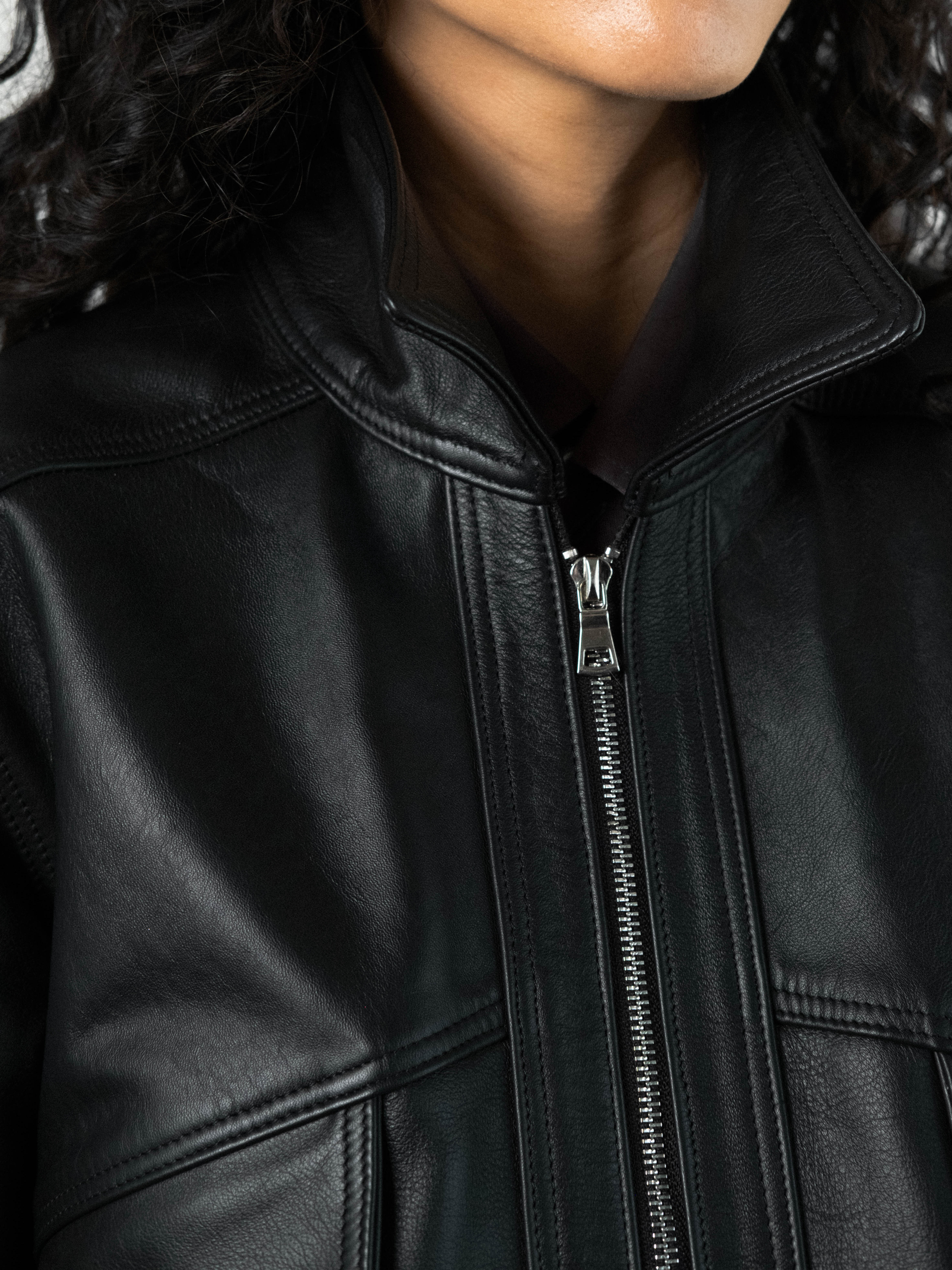 Aviator jacket in a supple, black sheep skin. Defined by a high, structured collar and oversized geometric patch pockets, the jacket strikes a balance between vintage flight gear and modern minimalism. Cut with a straight, boxy fit and a dropped shoulder, it features a heavy-duty silver-tone zip closure and reinforced topstitching. Designed with a clean-lined hem and cuffs, the piece offers a protective, weighted feel. The premium leather provides a natural sheen ensuring the garment develops a unique patina.