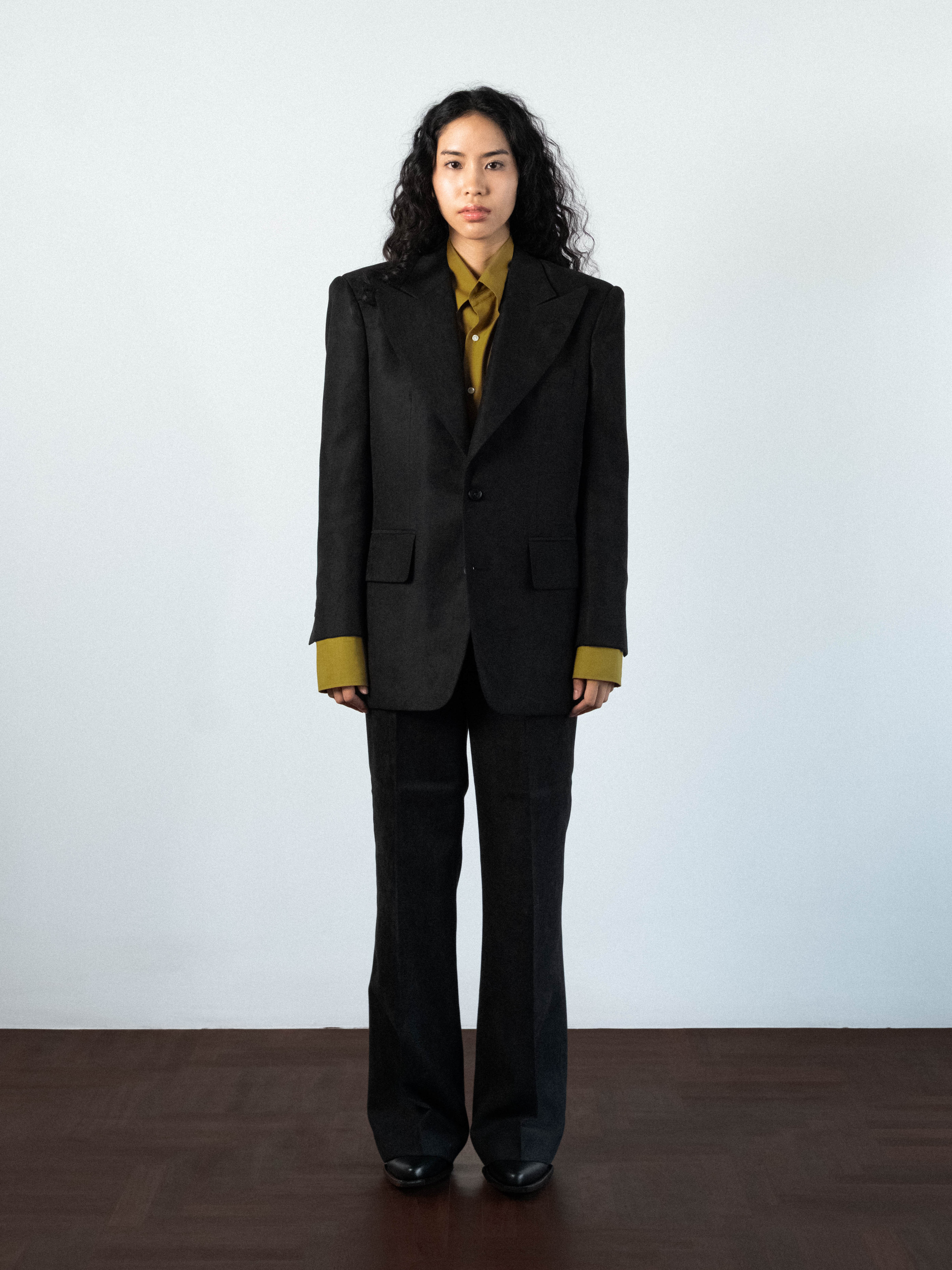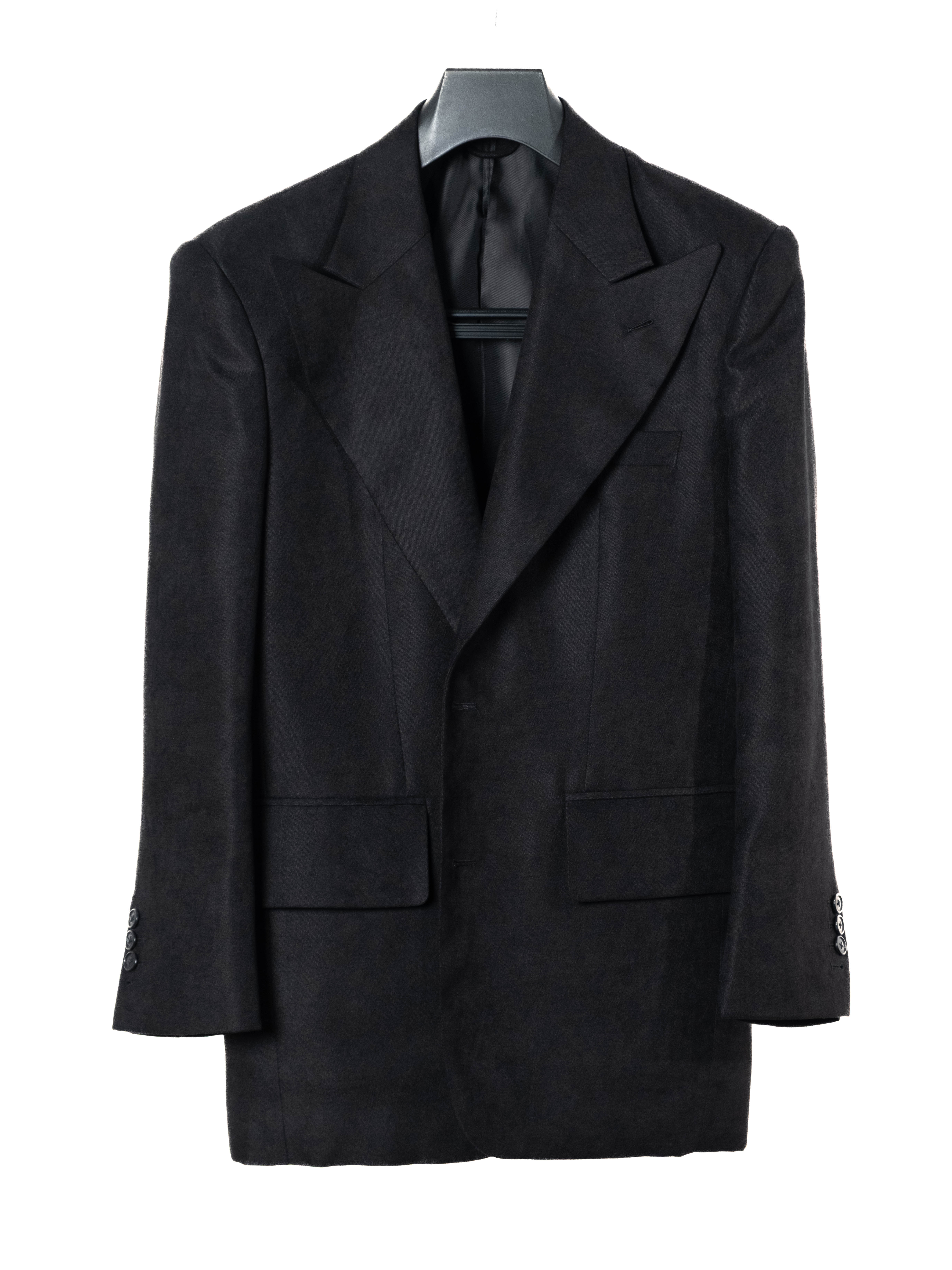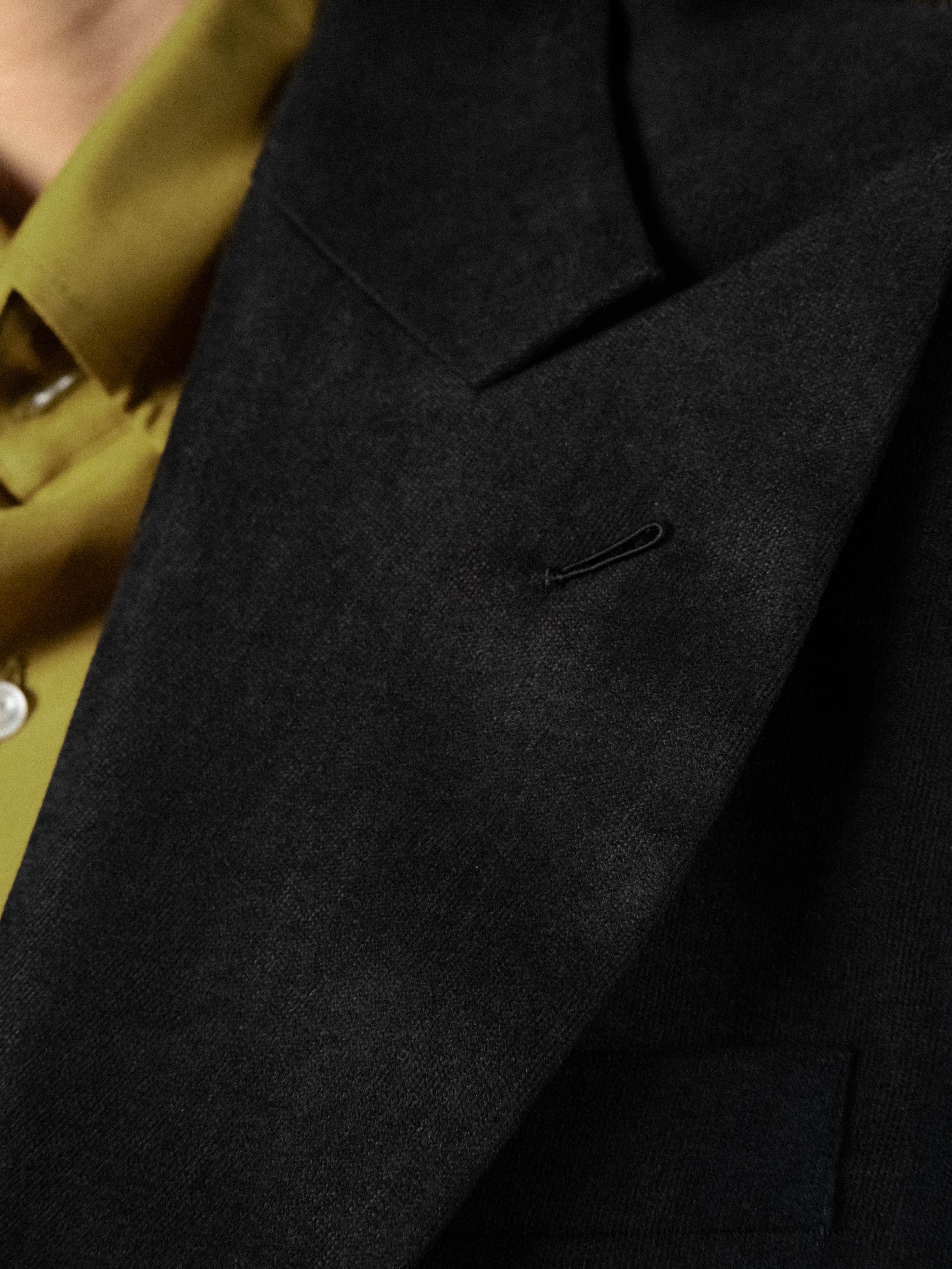 Tailored, hand-sawn half-canvas structure, jacket in black velvety fabric. Fully lined and cut with a sharp silhouette, the jacket features wide peak 4.7 inch lapels and soft-padded shoulders with strong shoulder silhouette. Designed with a single-breasted two-button closure, a Milanese buttonhole, functional sleeve buttonholes, double back vents, and flap pockets. The velvet texture creates a rich depth of color and a soft, tangible sense, while the solid weight ensures the form is maintained.