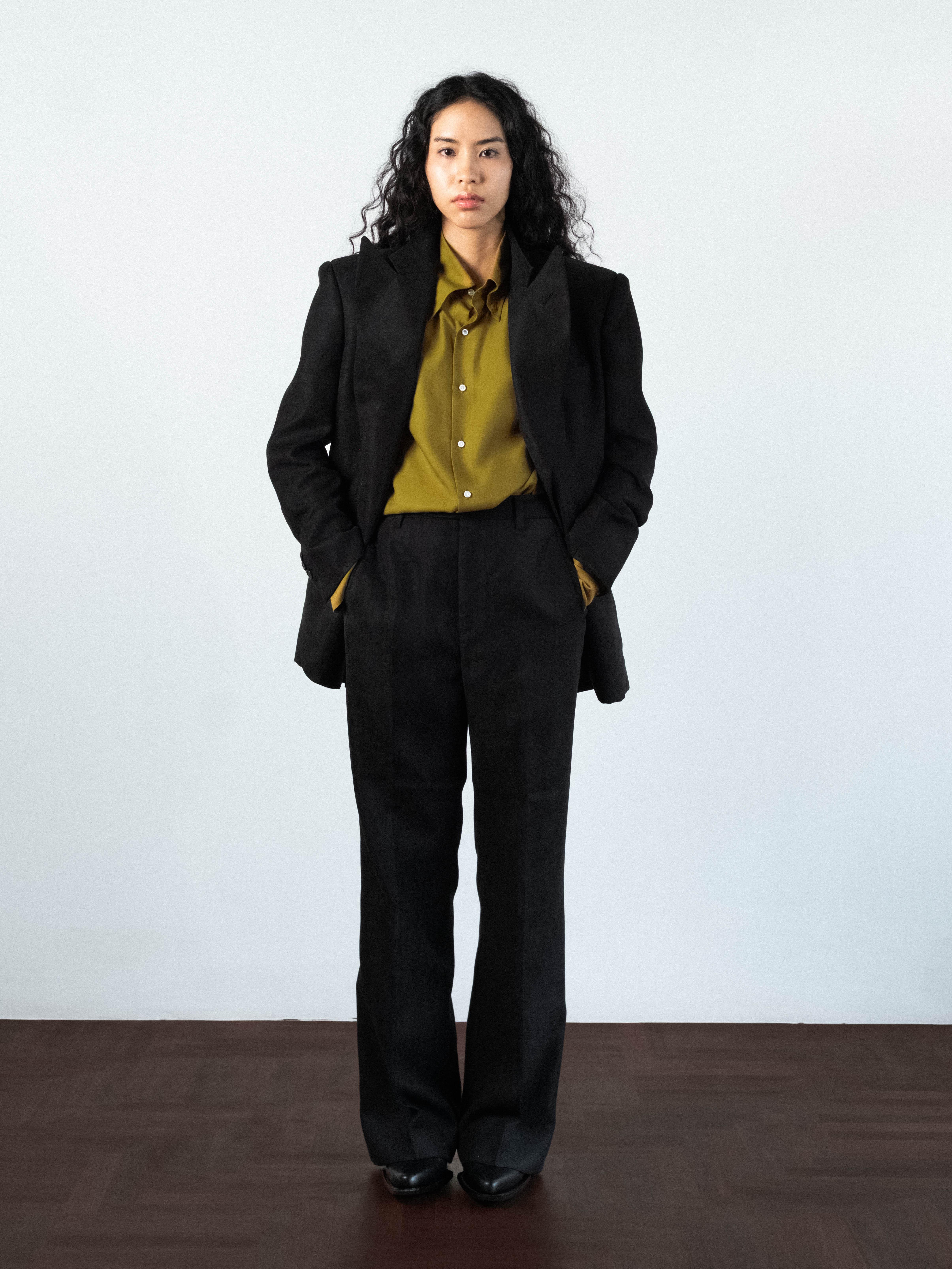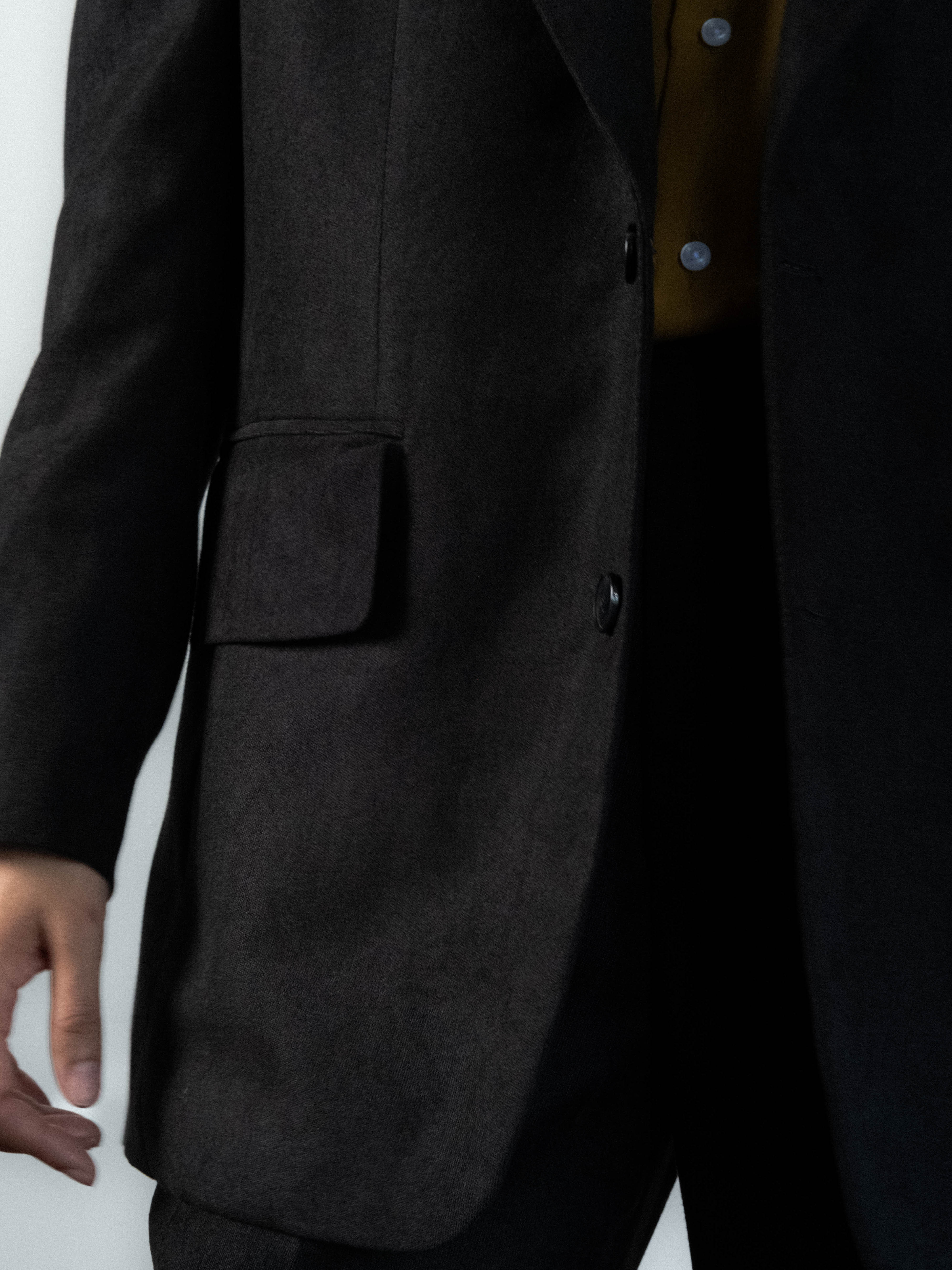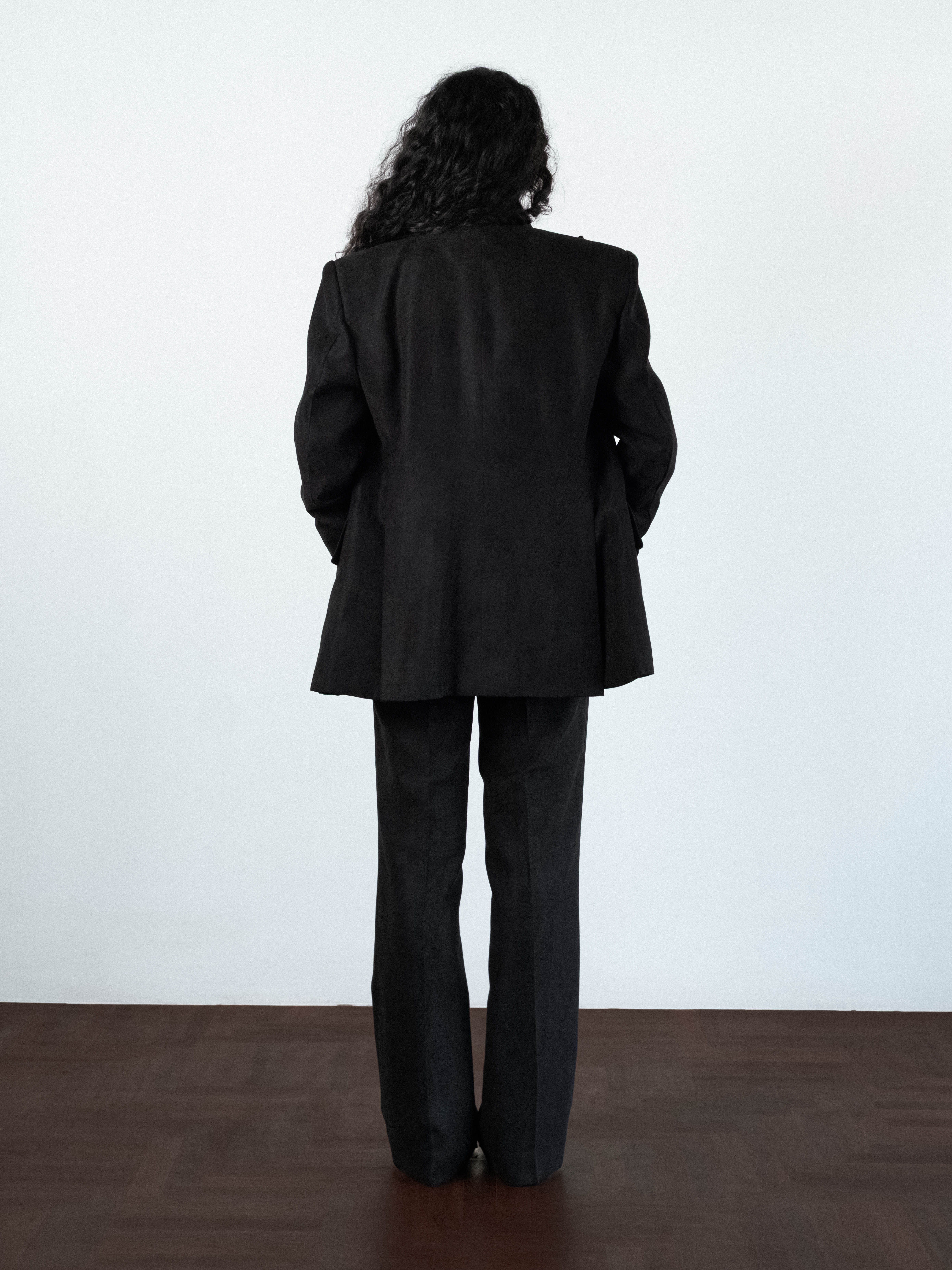 Tailored, hand-sawn half-canvas structure, jacket in black velvety fabric. Fully lined and cut with a sharp silhouette, the jacket features wide peak 4.7 inch lapels and soft-padded shoulders with strong shoulder silhouette. Designed with a single-breasted two-button closure, a Milanese buttonhole, functional sleeve buttonholes, double back vents, and flap pockets. The velvet texture creates a rich depth of color and a soft, tangible sense, while the solid weight ensures the form is maintained.