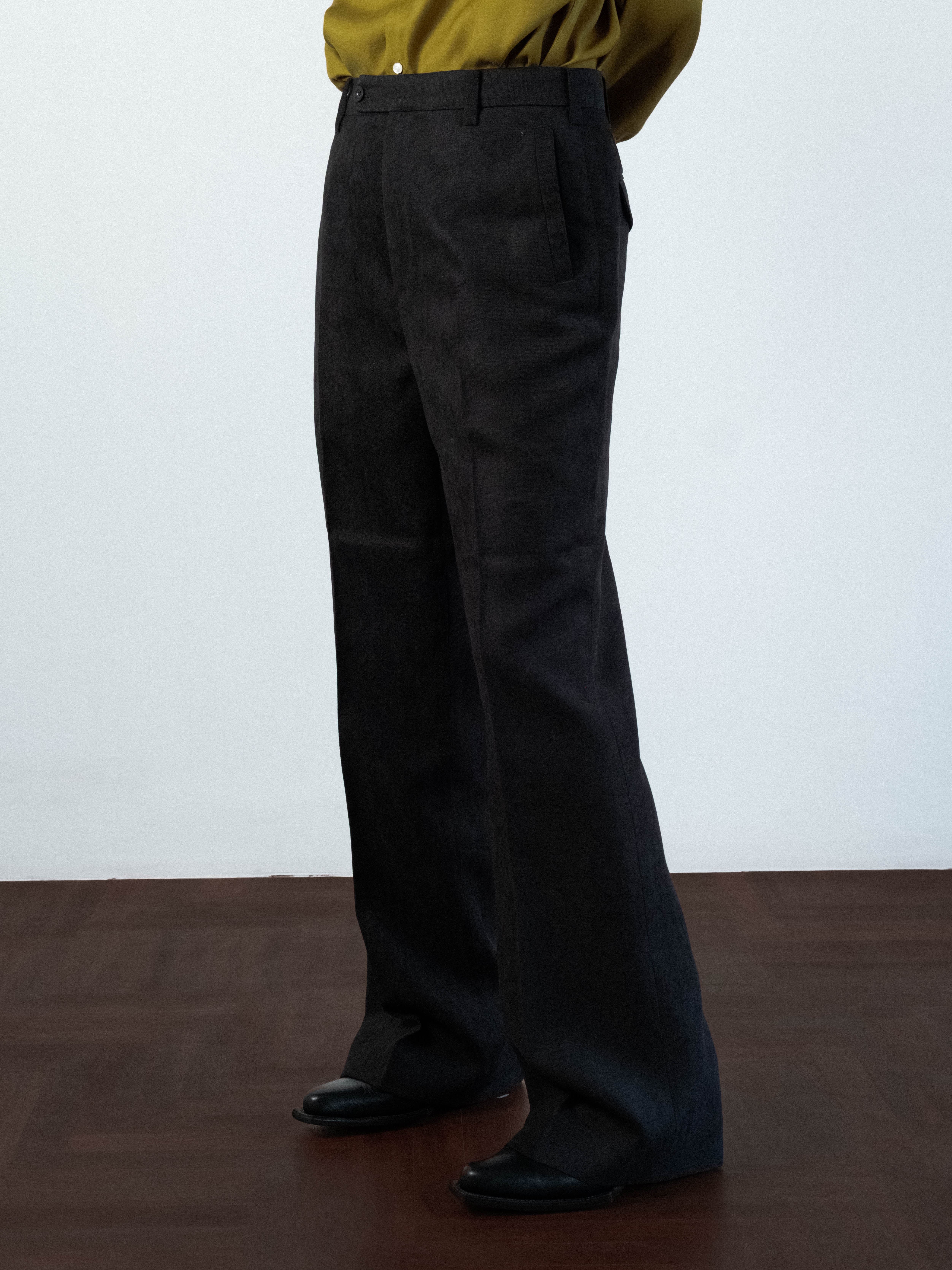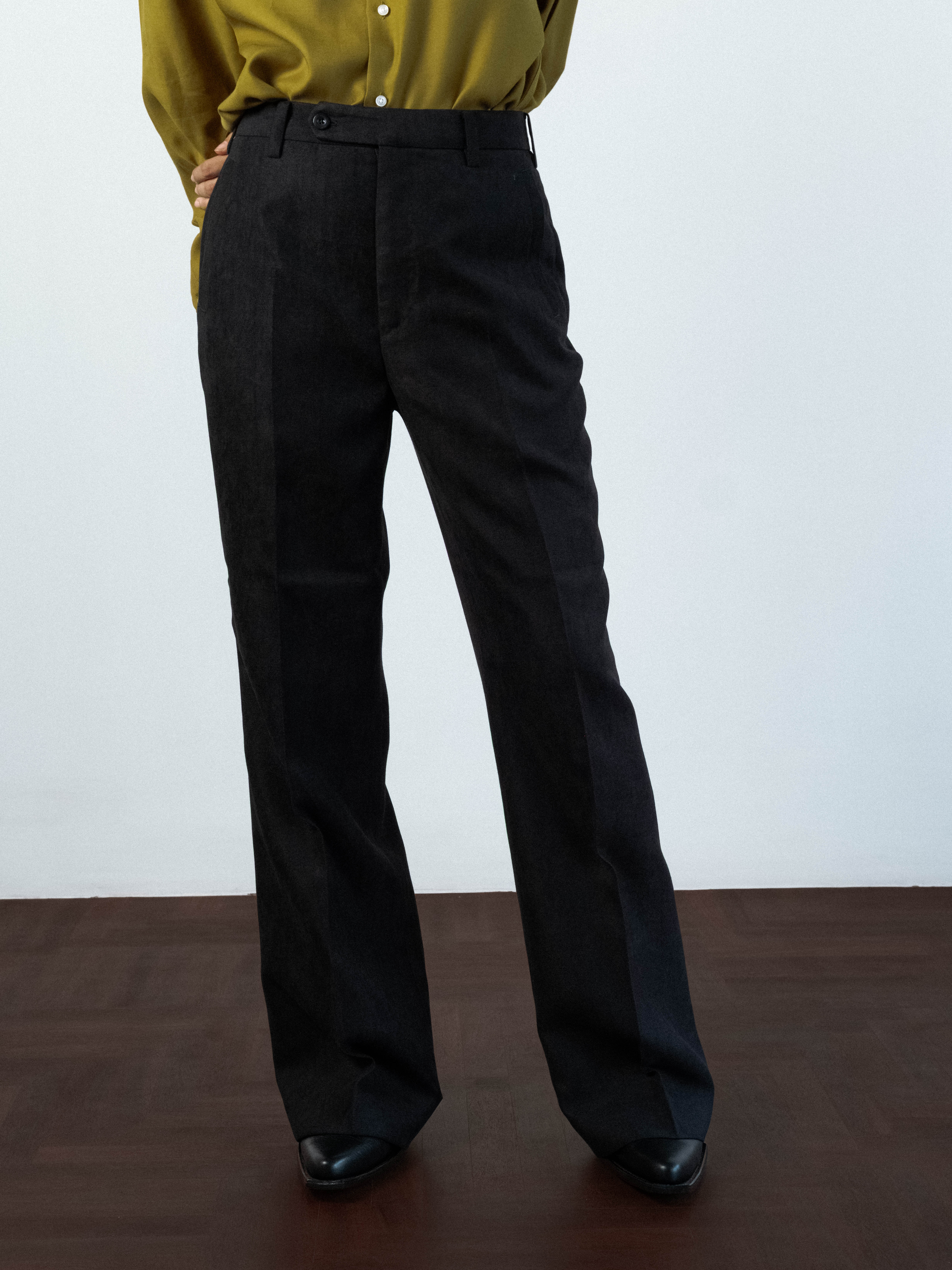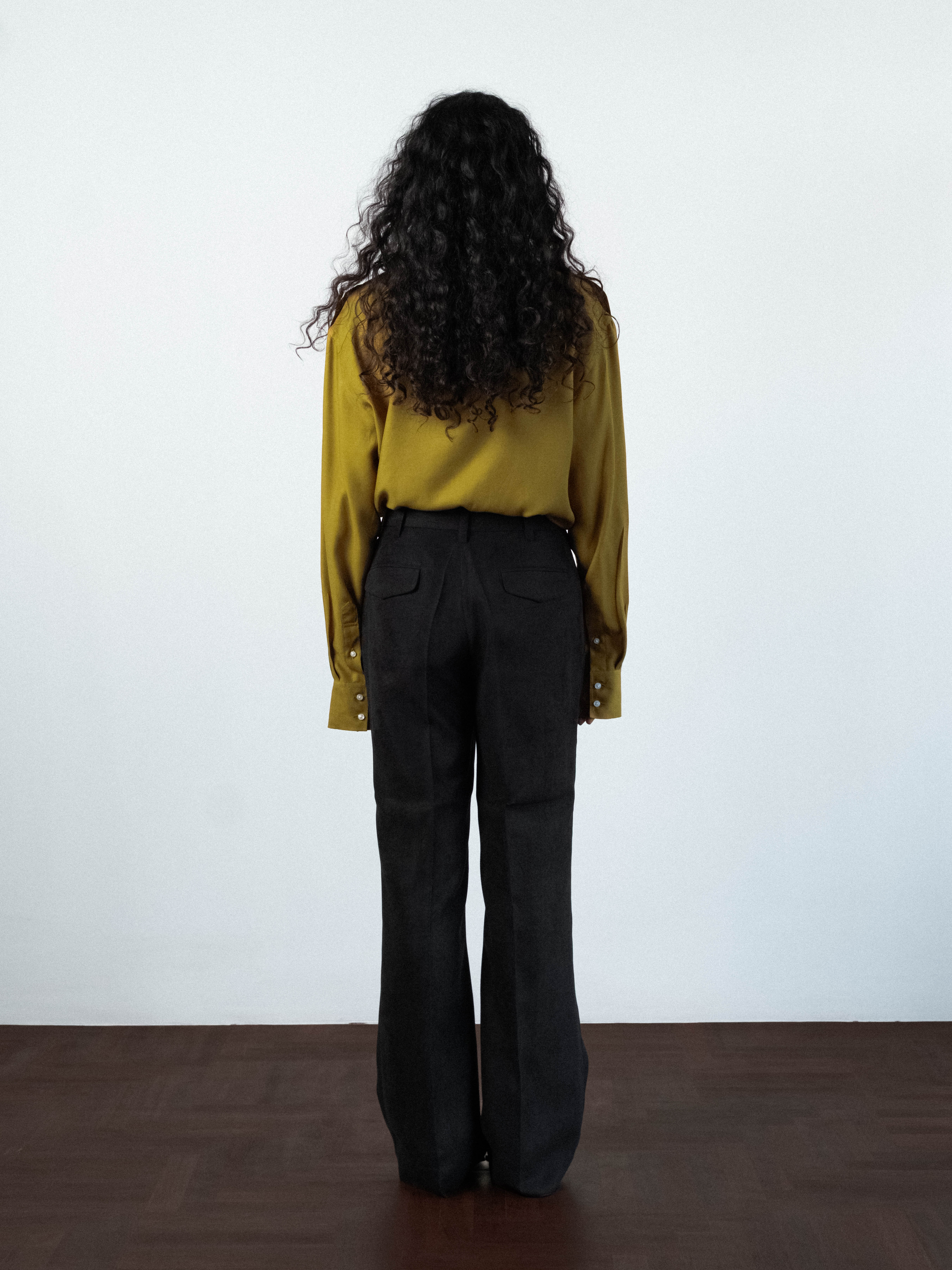 Velvet trousers cut to sit on the HIGH waist, featuring a structured waistband with a clean button closure and traditional belt loops. Precision-pressed flat front extend from the waist to the thigh, creating volume that transitions into a wide, straight leg. Pick stitching functional 2 side pockets and 2 back flap pockets, are integrated into the silhouette. Designed to hit the floor at the perfect length.