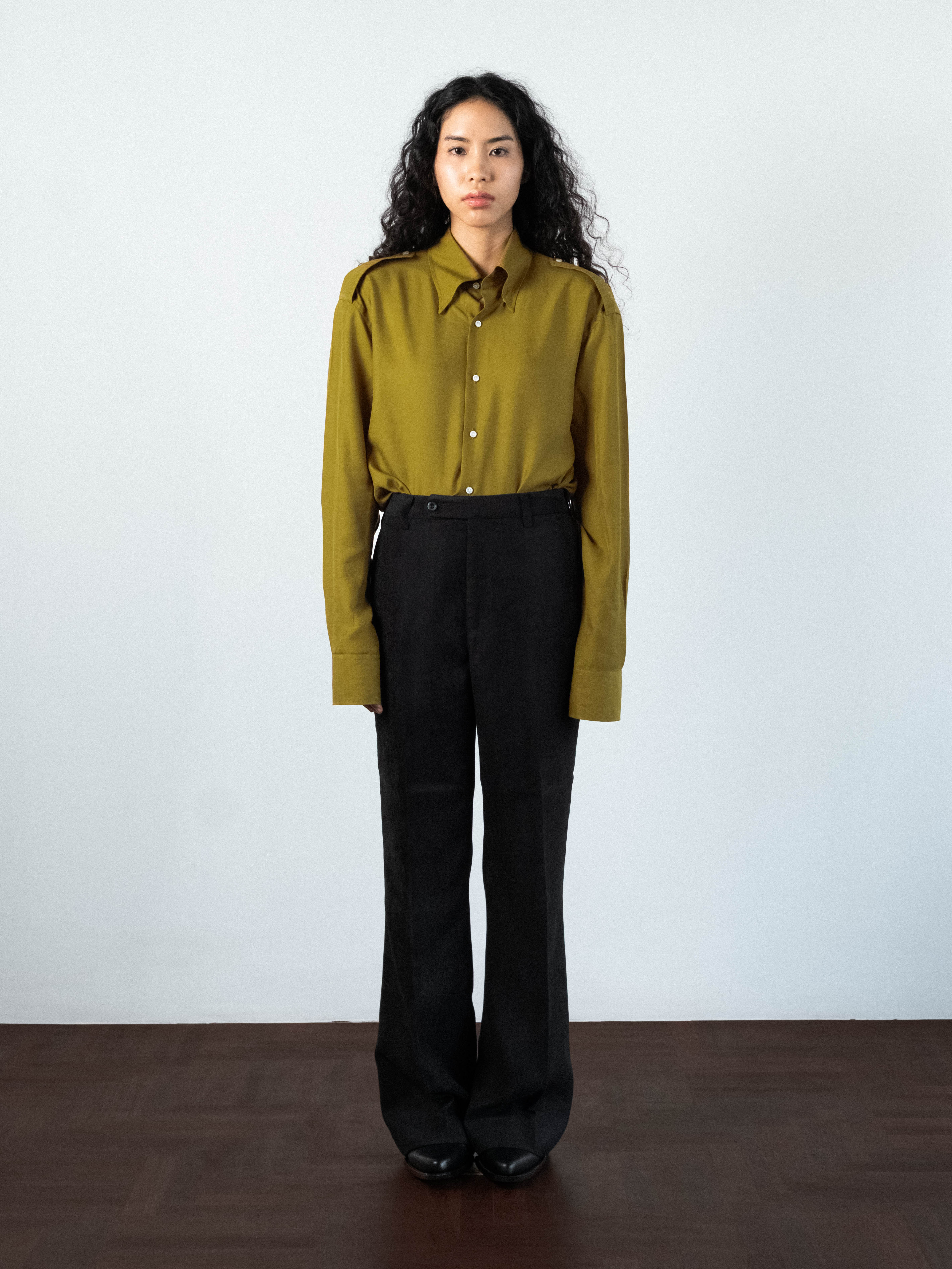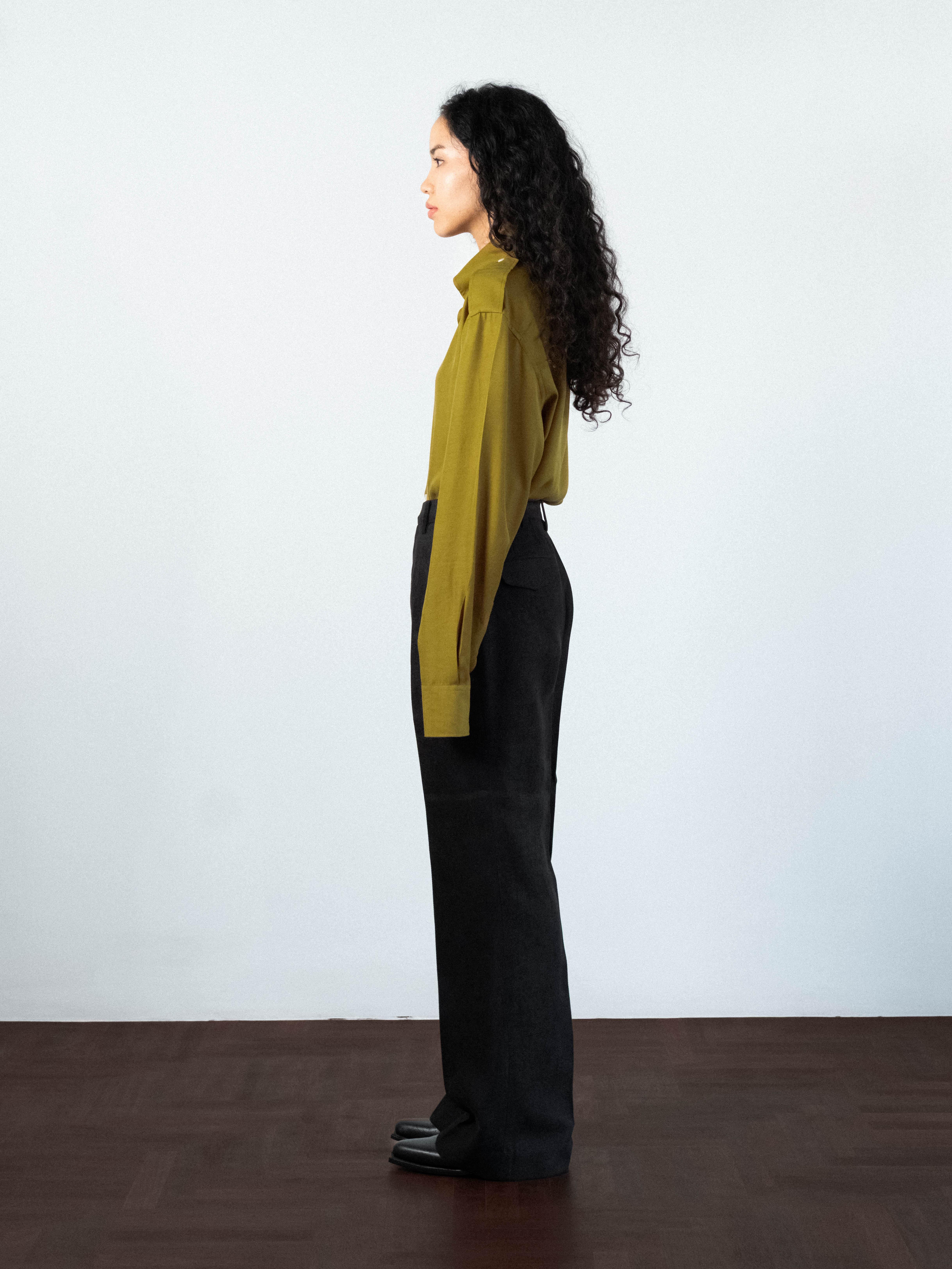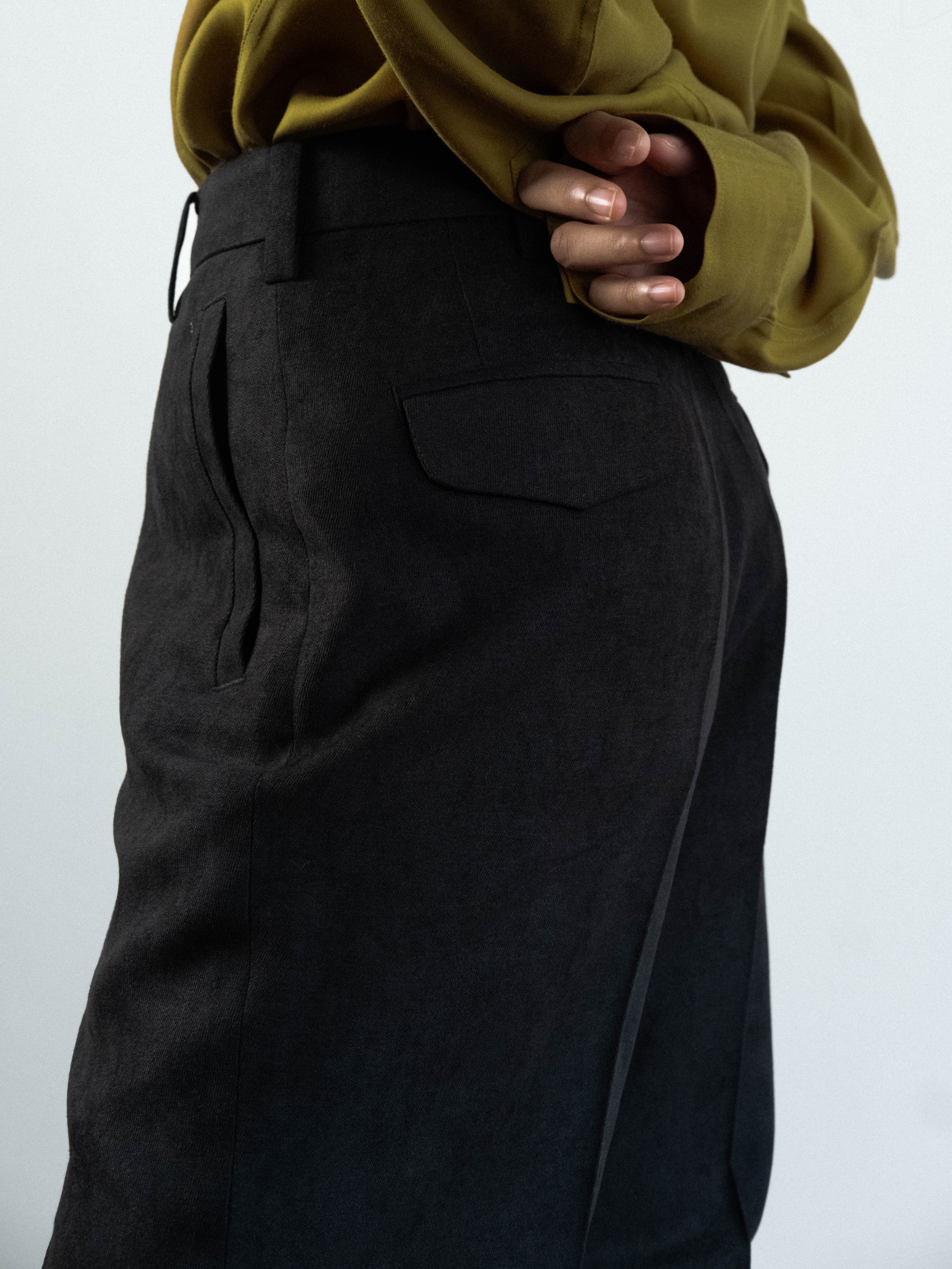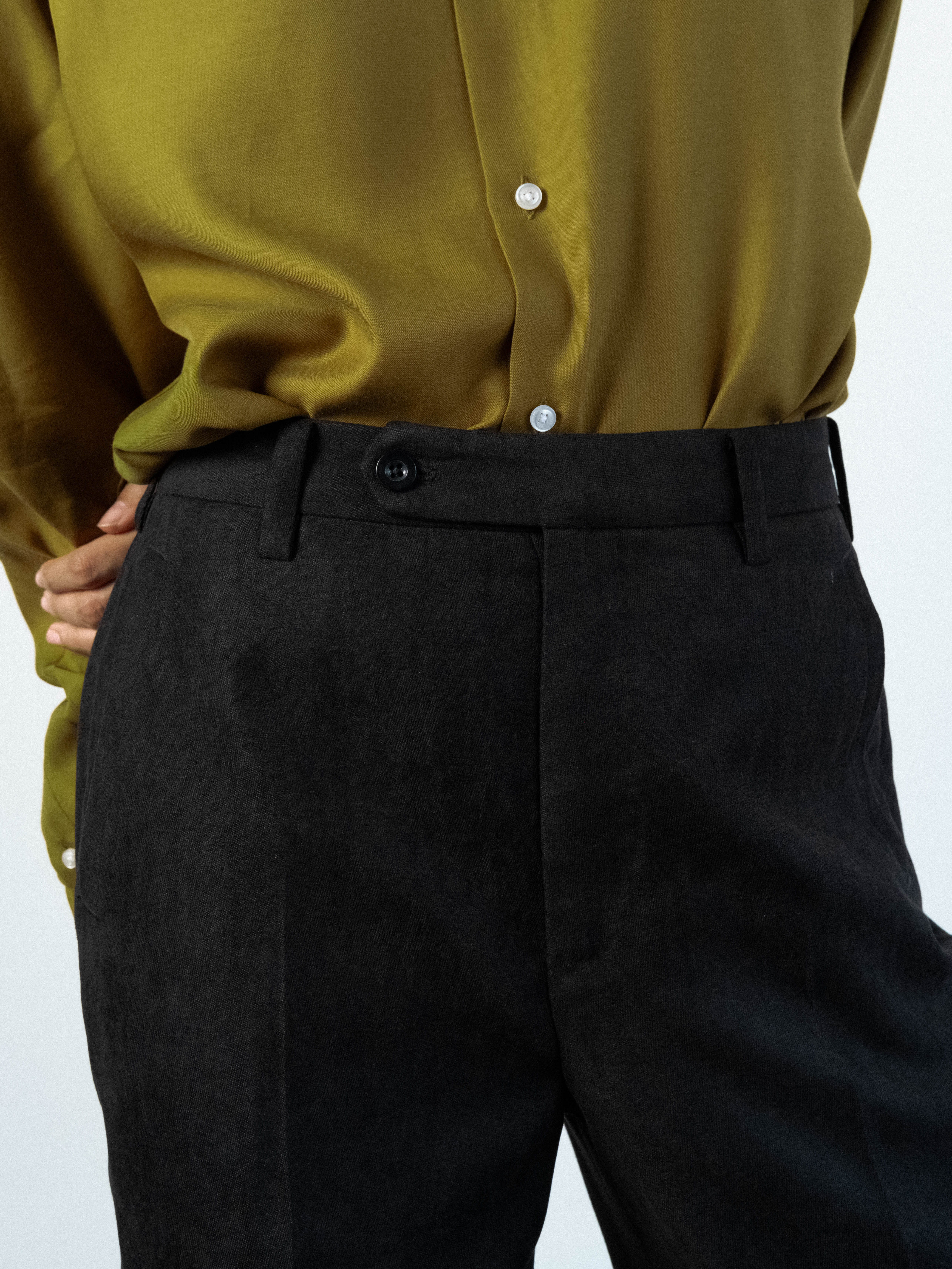 Velvet trousers cut to sit on the HIGH waist, featuring a structured waistband with a clean button closure and traditional belt loops. Precision-pressed flat front extend from the waist to the thigh, creating volume that transitions into a wide, straight leg. Pick stitching functional 2 side pockets and 2 back flap pockets, are integrated into the silhouette. Designed to hit the floor at the perfect length.