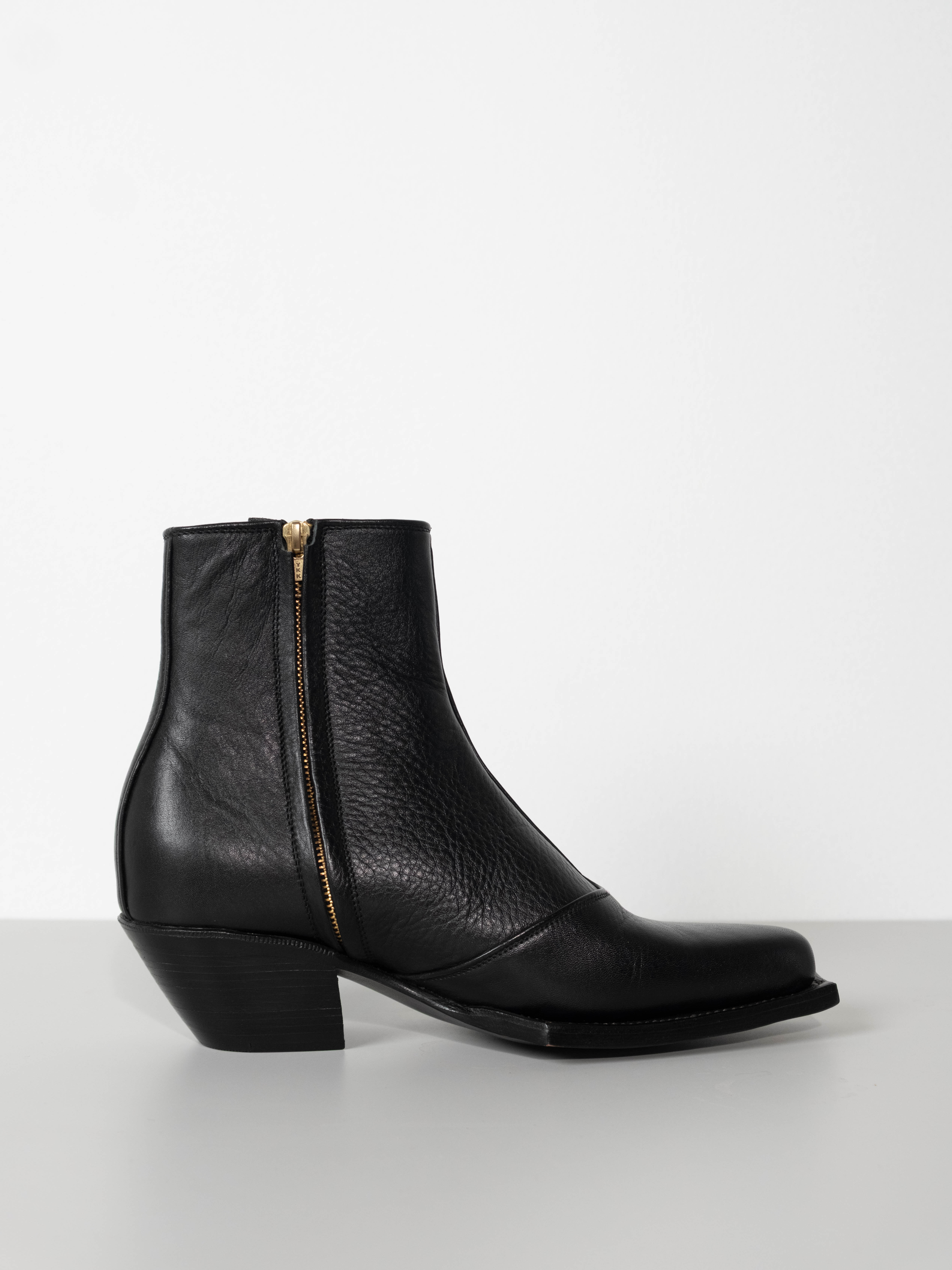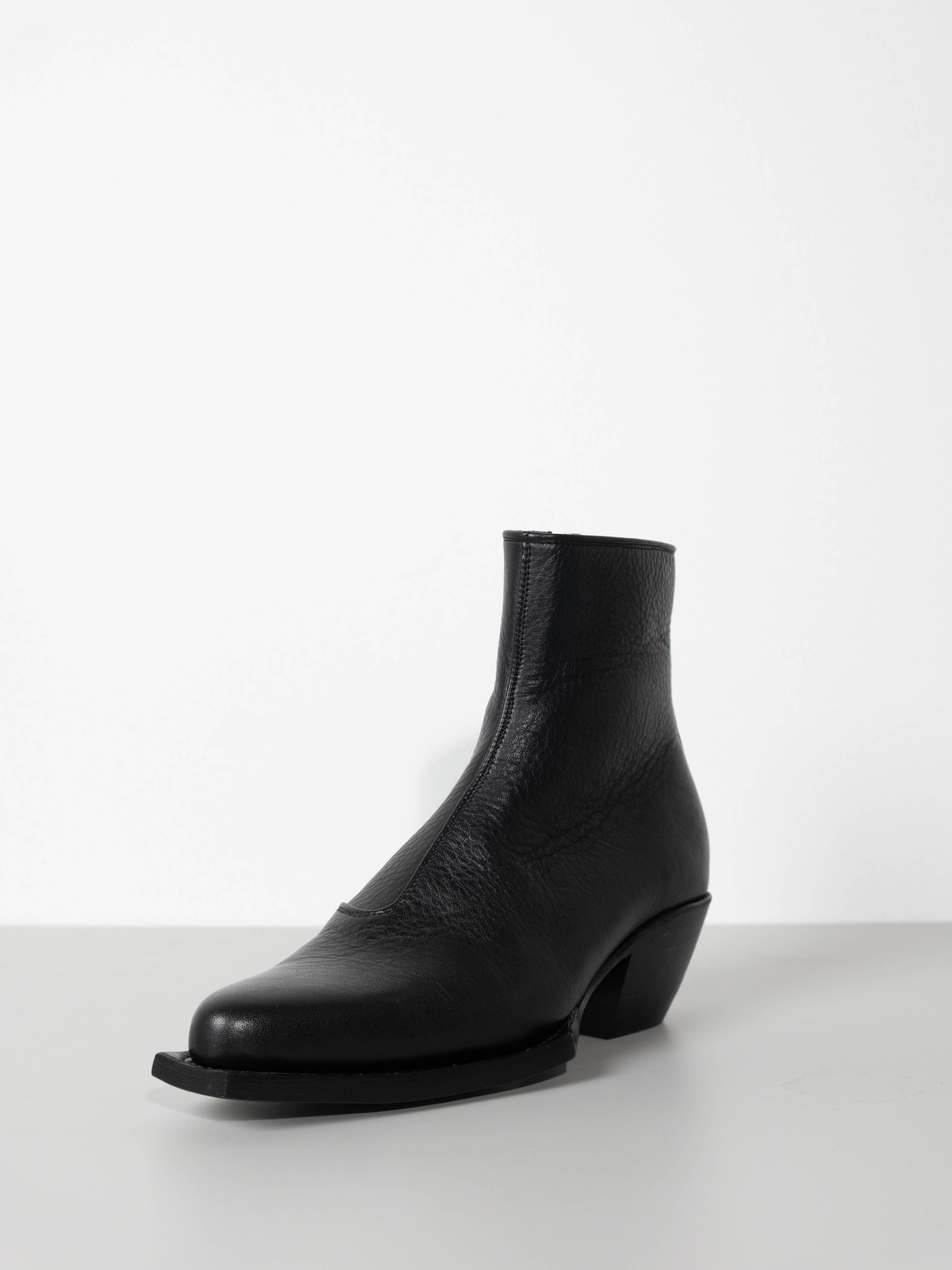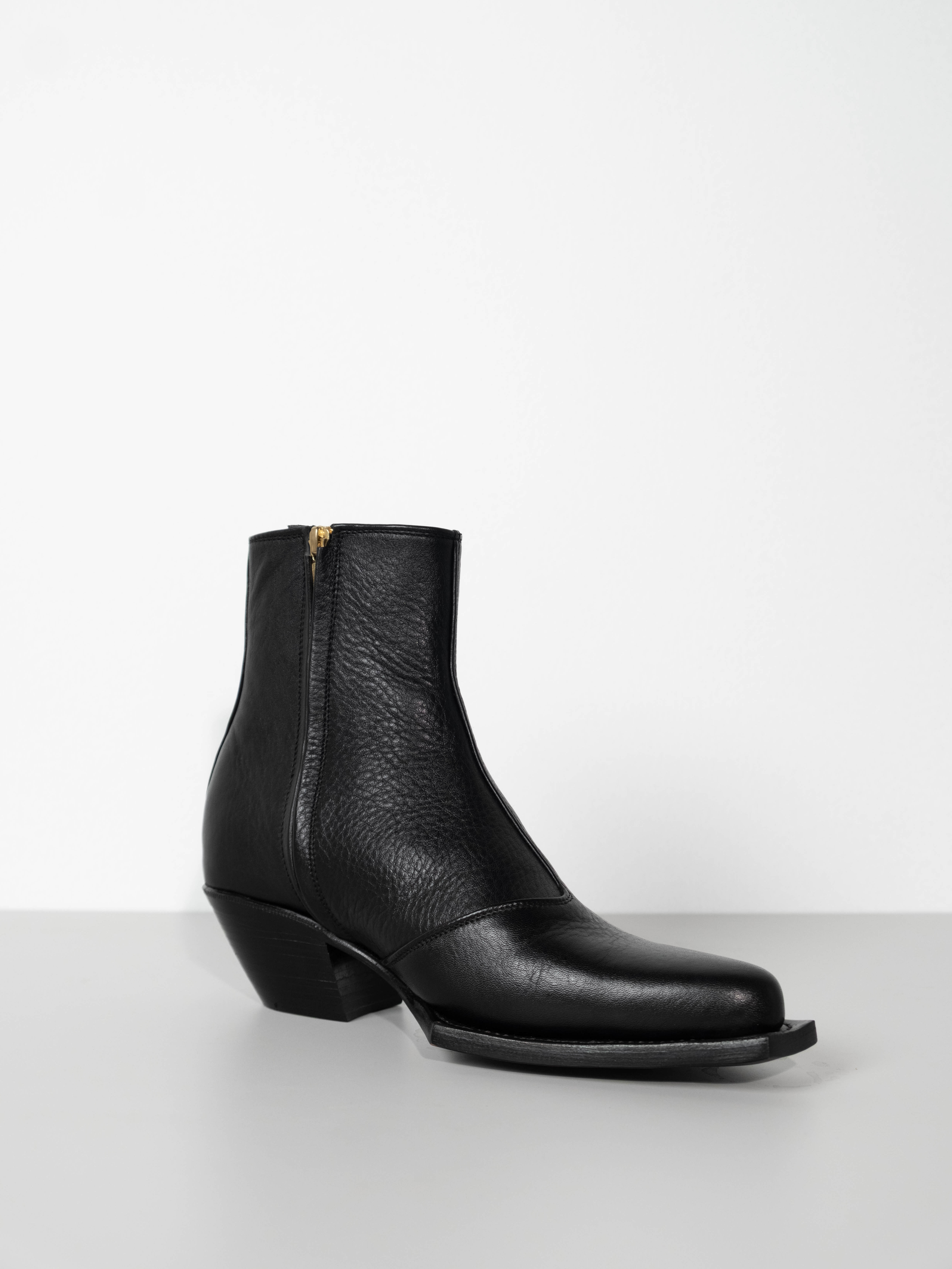 Hand crafted using full-grain cow leather. Featuring a sharp, point toe with square platform and a sculpted 5 CM Cuban heel, they offer a modern Western-inspired silhouette. A discreet side-zip closure ensures a streamlined fit, while the durable leather construction promises lasting comfort. Versatile and bold.